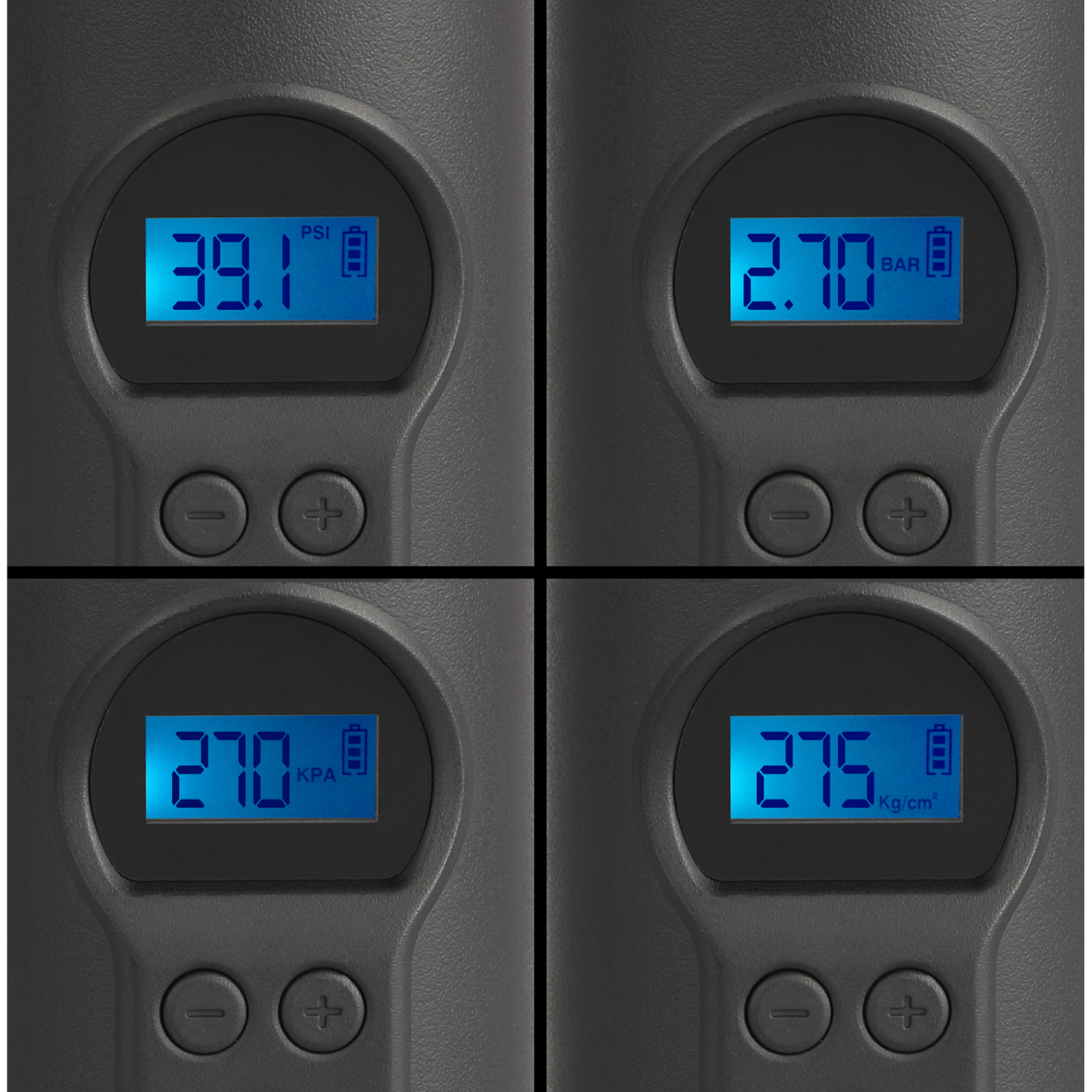 4 unités de mesures : PSI, BAR, KPA, kg/cm²