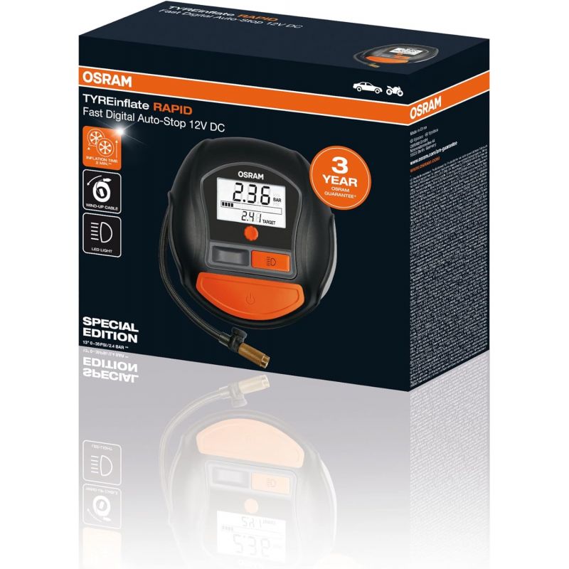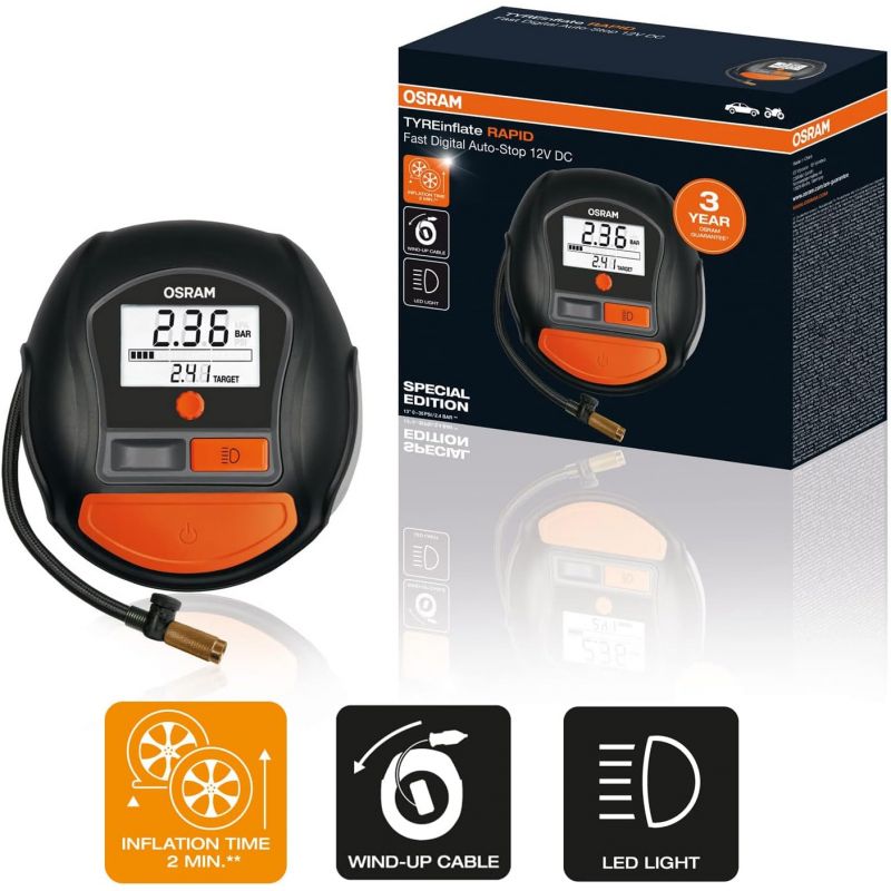 OSRAM TYREinflate RAPID, compresseur numérique et portable, arrêt automatique, lumière LED, programmable, pompe à air électrique pour pneus, connexion 12V, gonflage des pneus en 2 min