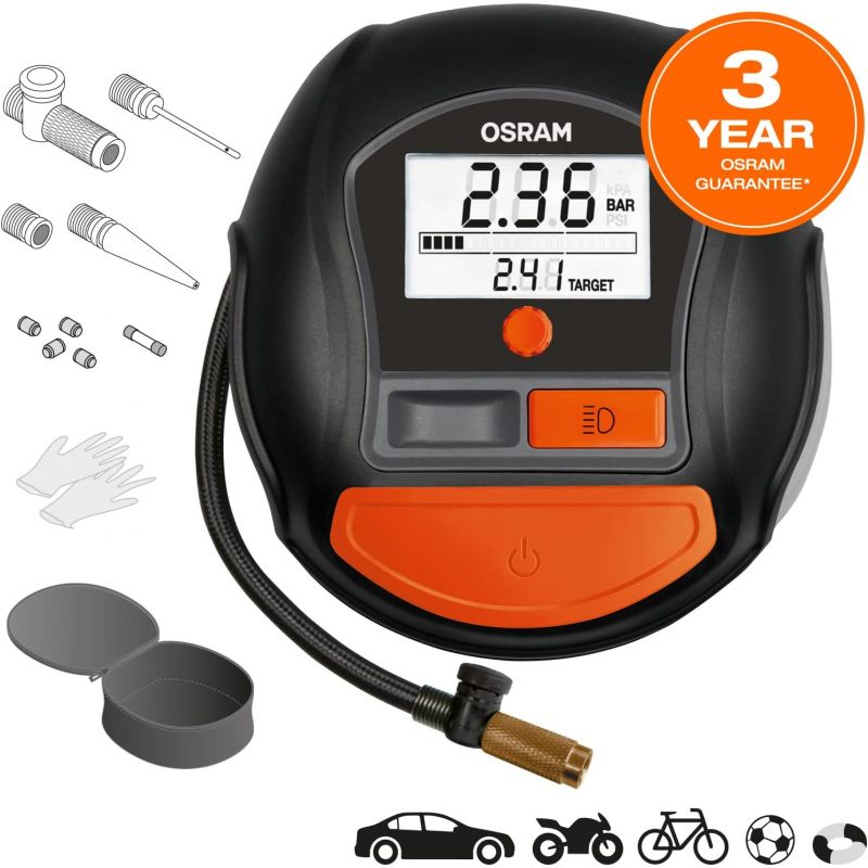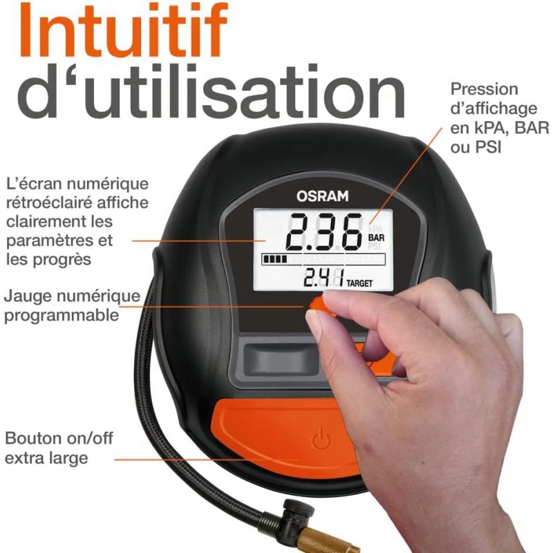 OSRAM TYREinflate RAPID, compresseur numérique et portable, arrêt automatique, lumière LED, programmable, pompe à air électrique pour pneus, connexion 12V, gonflage des pneus en 2 min
