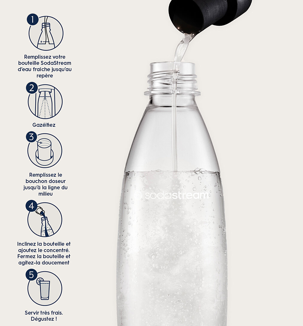 -1 bouchon doseur, pour un résultat optimal -Contenance 440 ml -Fini la corvée des packs de bouteilles -9 bouteilles Sodastream grand modèle