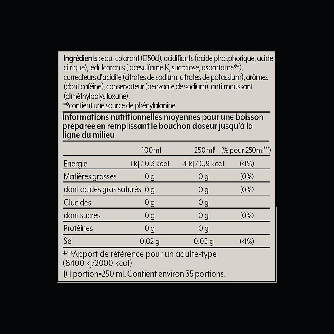 Ingrédients : sucre, eau, colorant (caramel E150d), acidifiants (acide phosphorique, acide citrique), correcteur d’acidité (citrate de sodium), édulcorants (sucralose, acésulfame-K), arômes dont caféine, stabilisateur (gomme arabique), conservateur (benzoate de sodium)
