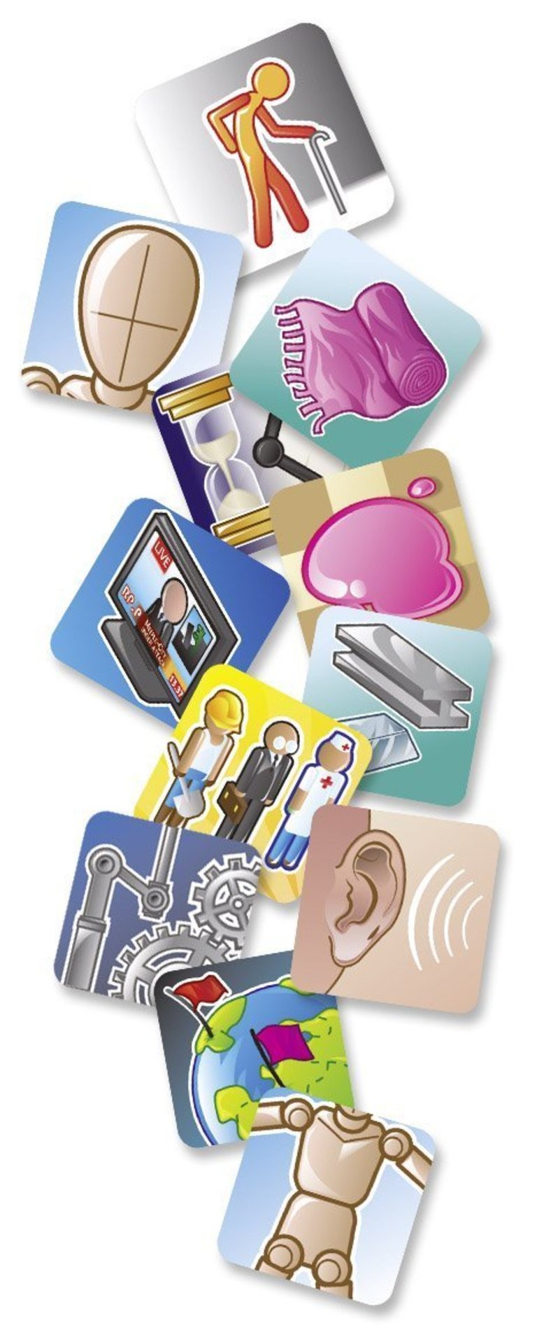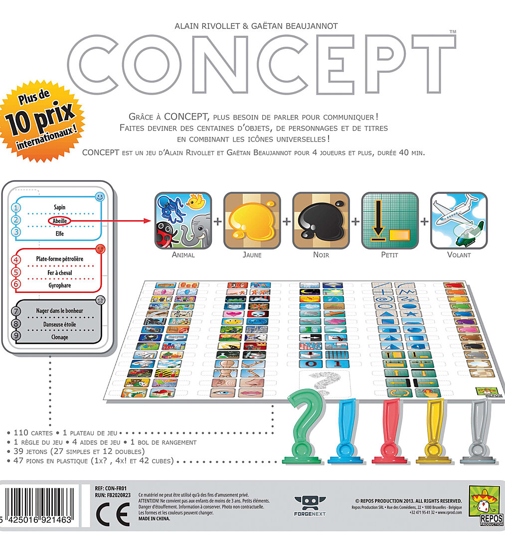 | La boîte contient | - 1 plateau d'icônes universelles - 5 séries de pions dont 1 série verte composée du pion Concept principal (grand point d'interrogation) et de 10 cubes, 4 séries (bleu, rouge,jaune, noir) chacune composée d'un pion Sous-Concept (point d'exclamation) et de 8 cubes - 110 cartes Concept - chacune comprenant 9 mots classés en 3 catégories de difficulté : Facile, Difficile, Challenge - des jetons Point Double et Simple (double à 2 points de victoire et simple à 1 point de victoire) - 2 aides de jeu - 1 bol de rangement - la règle du jeu |