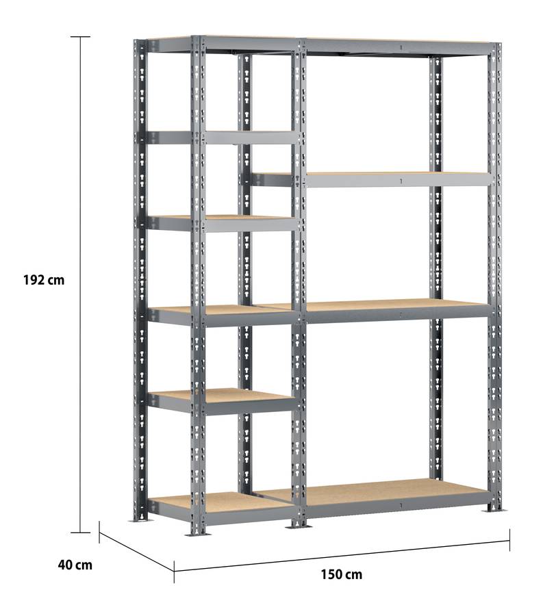 Etagère double charge lourde 10 plateaux longueur 150 cm comprenant une étagère 6 plateaux 40x50xH 192 cm et une étagère charge lourde 4 plateaux 40x100xH 192 cm