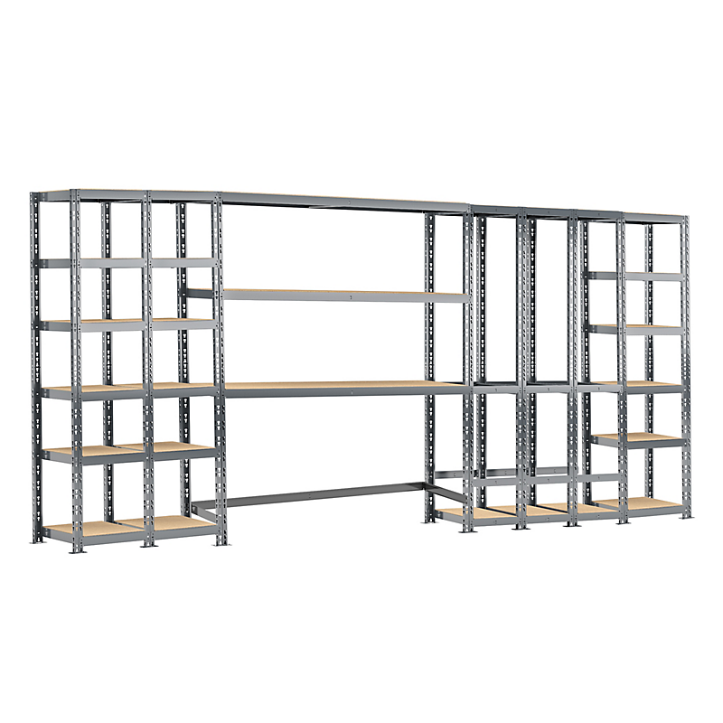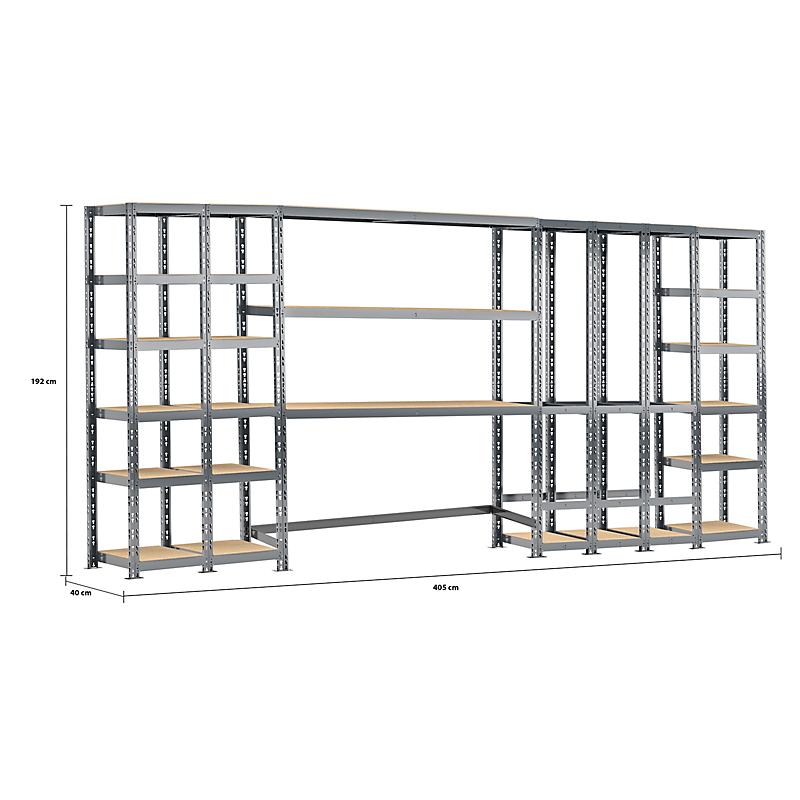 Etagère MODULÖ STORAGE quintuple charge lourde 21 plateaux + 3 box longueur 405 cm comprenant 3 étagères charge lourde 6 plateaux 40x50xH 192 cm et une étagère rack 3 plateaux 40x150xH 192 cm livrée avec montants de renfort au sol anti-écartement et une étagère de rangement verticale 3 box dimensions 40x105xH 192 cm livrée avec plateaux bas et plateaux hauts