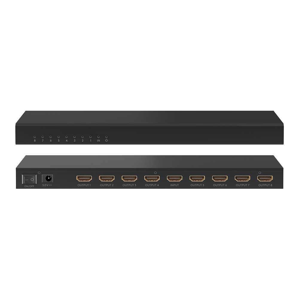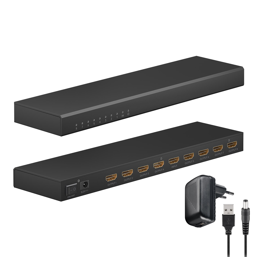 Splitter HDMI 2.0 4K60 8 sorties Splitter HDMI qui distribue un signal vers 8 sorties HDMI comme un téléviseur, un écran d'ordinateur ou un vidéoprojecteur. La multiprise HDMI transmet les signaux audio et vidéo sur les appareils connectés. Il supporte des résolutions jusqu'à 4K @ 60 Hz et toutes les résolutions inférieures. Les LEDs situées à l'avant du splitter indiquent quels ports sont activés.Le distributeur HDMI est alimenté via le port micro USB (chargeur et câble fournis).Caractéristiques : - Entrée(s) : 1 x HDMI femelle - Sortie(s) : 8 x HDMI femelle - Résolutions : Jusqu'à 4K Ultra HD 2160p 60 Hz - Débit : 18 Gbps