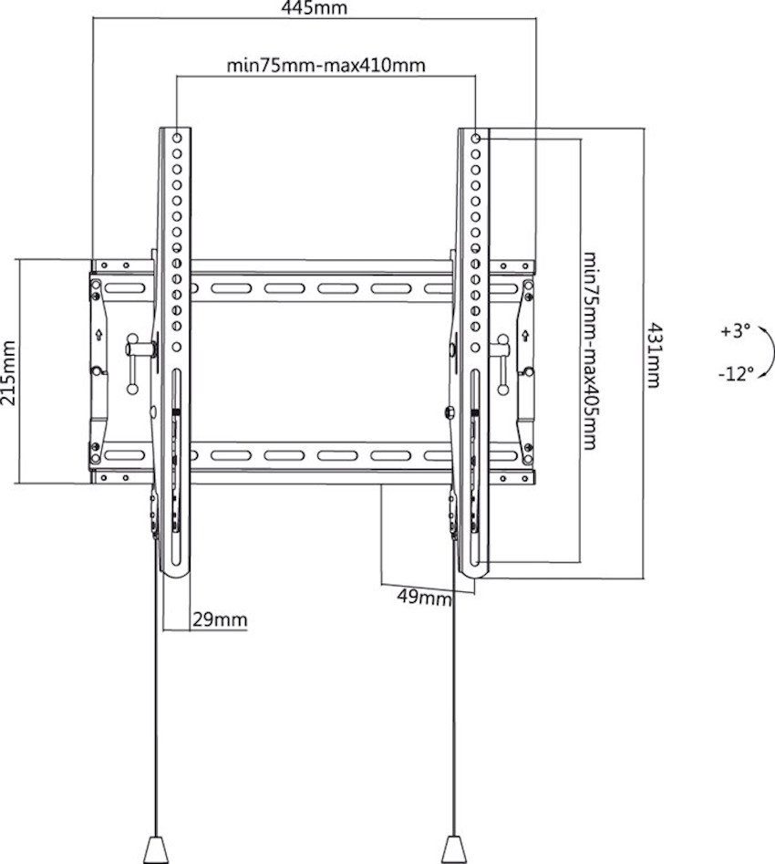 Support écran mural TV inclinable professionnel pour écrans 32 à 55' jusqu'à 70 kgLe support mural TV de basculement pour chaque TV avec une taille de 32 à 55 pouces (81 à 140 cm) et un poids de 70 kg. Vous pouvez basculer entre 3° et 12°. La fermeture de printemps avec auto bloqueurs facile à résoudre automatiquement et fournit un moyen simple et sécurisé de montage de votre écran plat sur le mur. Le téléviseur peut être déplacé vers la gauche et à droite sur la plaque murale pour le positionner avec précision.Le support mural plat maintient le téléviseur élégamment plat et peu encombrant sur le mur avec seulement 49 mm et peut également être incliné jusqu'à 12°.Automatic Click-in & Easy Release - L'aide au montage avec verrouillage à ressort pour un encliquetage et un déverrouillage sûrs lors de l'accrochage du téléviseur (pas de vis de blocage à fixer manuellement) rend l'installation un jeu d'enfant.Le niveau à bulle intégré assure un alignement facile de l'installation.Montage facile et compatible avec les normes VESA 75x75, 100x100, 100x150, 150x100, 150x150, 200x100, 100x200, 200x200, 300x200, 300x300, 400x200, 400x300, 400x400.Convient à la plupart des téléviseurs plats et courbes de toutes les marques populaires (p. ex. Samsung (également QLED et LED), Sony, Philips, LG) et de toutes les tailles ( 32', 40', 43', 49', 50', 55')Spécifications techniques Taille de l'écran : XL (109-254cm / 43-100')Charge max. 60 kg Distance par rapport au mur : 77 - 428 mmPlage de rotation/pivotement : 60 °Plage d'inclinaison/de basculement : 10 °VESA (FDMI) 75x75, 100x100, 100x150, 150x100, 150x150, 200x100, 100x200, 200x200, 300x200, 300x300, 400x200, 400x300, 400x400mmCouleur : noir Matériau : Acier (thermolaqué) Largeur : 445 mm Hauteur : 441 mm Profondeur : 19 mmGarantie : 5 ans Matériel de montage Chevilles, Vis