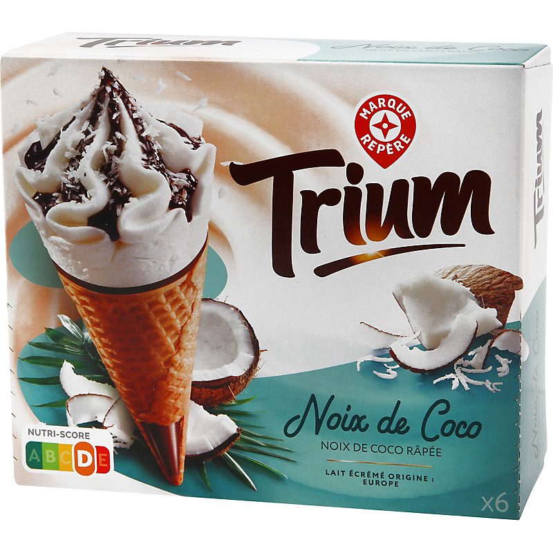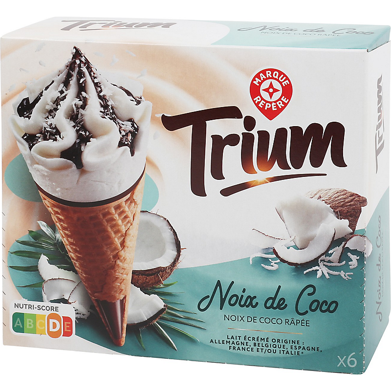 Cornets de glace à la noix de coco avec des inclusions de noix de coco râpée dans une gaufrette avec un chemisage et une pointe au cacao maigre. Décors : cacao maigre et noix de coco râpée. TRIUM