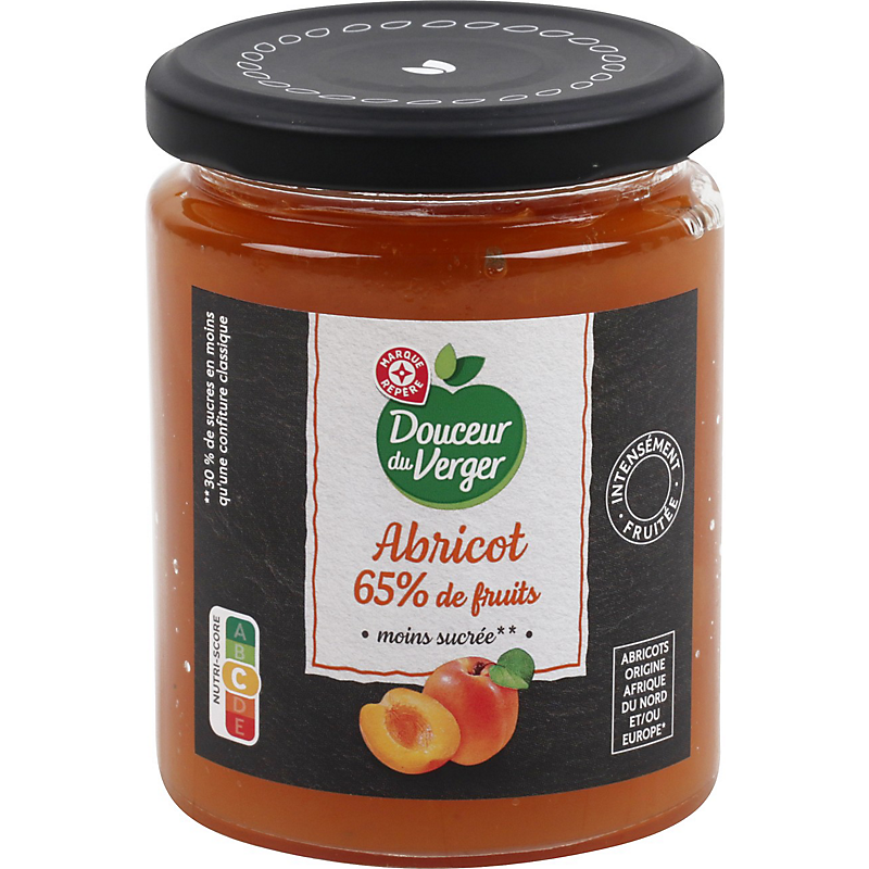 Confiture extra d'abricots, allégée en sucres**. ** 30% de sucres en moins qu'une confiture classique. DOUCEUR DU VERGER