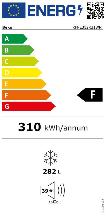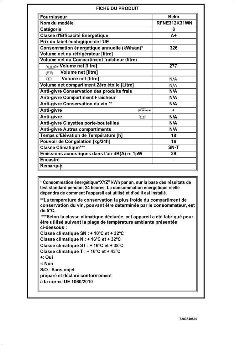 Beko RFNE312K31WN. Capacité net du congélateur: 282 L, Classe climatique: SN-T, Capacité de congélation: 16 kg/24h, Autonomie en cas de panne de courant: 18 h, Niveau sonore: 39 dB, Nombre d'étoiles (indique les possibilités de conservation): 4*, Système anti-gel. Emplacement charnière de porte: Droite. Classe d'efficacité énergétique: F, Consommation annuelle d'énergie: 311 kWh. Couleur du produit: Blanc