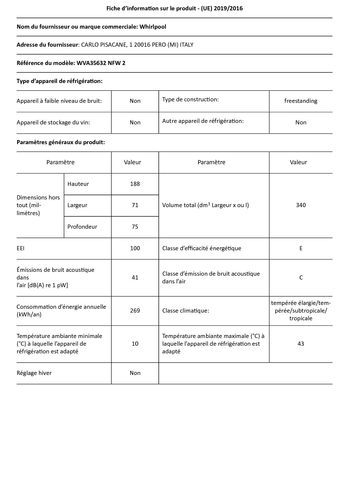Whirlpool WVA35632NFW2. Capacité net du congélateur: 340 L, Classe climatique: SN-T, Capacité de congélation: 28 kg/24h, Autonomie en cas de panne de courant: 35 h, Niveau sonore: 40 dB, Nombre d'étoiles (indique les possibilités de conservation): 4*. Emplacement charnière de porte: Droite. Classe d'efficacité énergétique: E, Consommation annuelle d'énergie: 269 kWh. Couleur du produit: Blanc