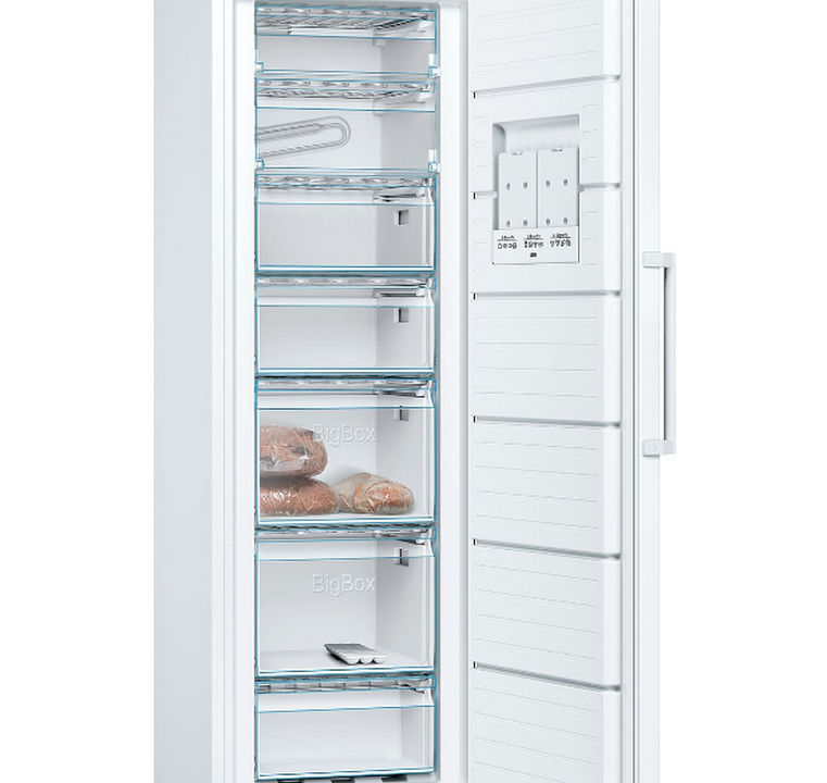 Le congélateur avec contrôle électronique de la température : régler la température facilement et avec précision. ● FreshSense : les capteurs internes et externes garantissent une température constante dans l'appareil malgré les variations de température. ● Alarme visuelle et sonore de température : sécurité alimentaire garantie, la fonction mémoire enregistre la température la plus élevée atteinte en cas de coupure de courant. ● Super congélation : permet d'abaisser rapidement la température du congélateur afin de pouvoir stocker de nouvelles denrées sans faire remonter la température du compartiment. ● Autonomie en cas de coupure électrique : votre appareil est capable de générer du froid pendant plusieurs heures. ● BigBox : compartiment pour les grands produits surgelés BOSCH - Congélateur armoire pose-libre - SERIE 4 - Blanc - Classe énergie E - Consommation électrique/an (kWh): 216 - Classe climatique: SN-T - Classe d'efficacité sonore D - 42 DB - Volume utile total: 249 l - congélateur: 249 l - H: 186,0 x L: 60,0 x P: 65,0 cm
