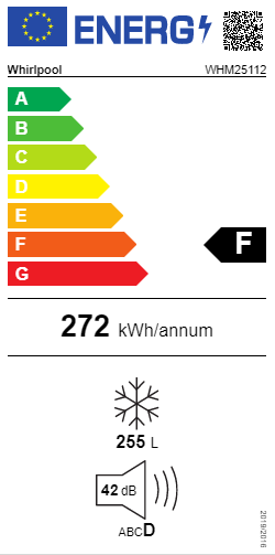 Whirlpool WHM25112. Capacité net du congélateur: 251 L, Capacité de congélation: 18 kg/24h, Autonomie en cas de panne de courant: 45 h, Niveau sonore: 42 dB, Système anti-gel. Emplacement charnière de porte: Haut. Consommation annuelle d'énergie: 194 kWh. Couleur du produit: Blanc