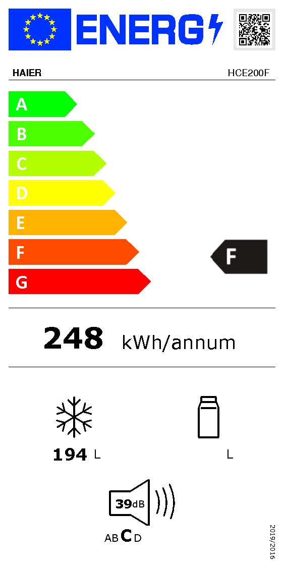Les congélateurs Haier sont en aluminium galvanisé avec une injection de mousse microcellulaire. Non seulement l’aluminium facilite le nettoyage mais il prolonge également sensiblement la durée de vie du produit, tandis que les propriétés isolantes de la mousse garantissent un haut rendement énergétique. Haier HCE200F. Capacité net du congélateur: 194 L, Classe climatique: T, Capacité de congélation: 18 kg/24h, Autonomie en cas de panne de courant: 18 h, Niveau sonore: 39 dB, Nombre d'étoiles (indique les possibilités de conservation): 4*. Emplacement charnière de porte: Haut. Classe d'efficacité énergétique: F, Consommation annuelle d'énergie: 248 kWh. Couleur du produit: Blanc