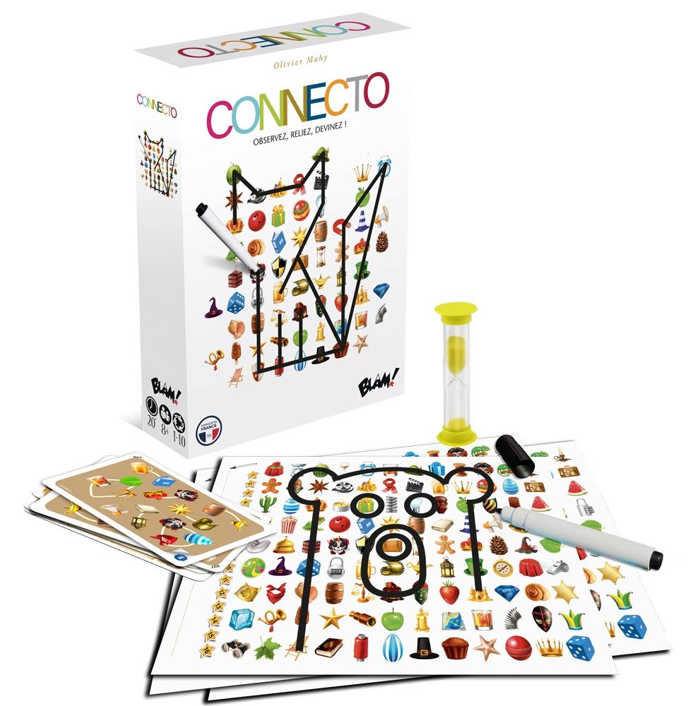 à partir de 8 ans moins de 30 min 1 à 10 joueur(s) Reliez les icônes de votre plateau en suivant la carte Enigme et faites apparaitre un objet. Pour gagner, soyez le premier à deviner ce que vous dessinez.Connecto reprend le principe du dessin mystère : reliez des points entre eux pour découvrir ce que l'on dessine. À chaque tour on révèle une carte constituée de plusieurs icones. Simultanément, les joueurs relient ces icones sur leur plateau leur permettant de tracer une forme. Le premier joueur à deviner ce qu'il dessine (même s'il n'a pas fini la forme), l'écrit sur son plateau et lance un compte à rebours pour les autres joueurs. Une fois le sablier terminé, les joueurs gagnent des points s'ils ont trouvé le bon objet représenté. Pendant chaque partie, devinez ainsi 8 objets parmi plus de 184 énigmes aux défis divers. Apprenez à jouer en douceur grâce à 3 tutoriels progressifs permettant de créer des dessins de plus en plus complexes.Connecto vous propose 4 modes de jeux différents : Compétition / Coopération / Équipes / Solo