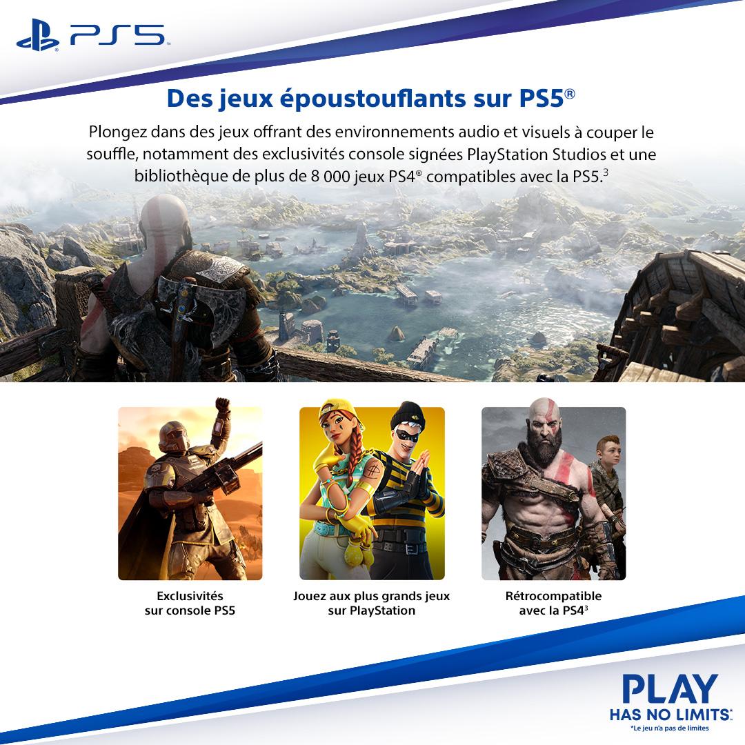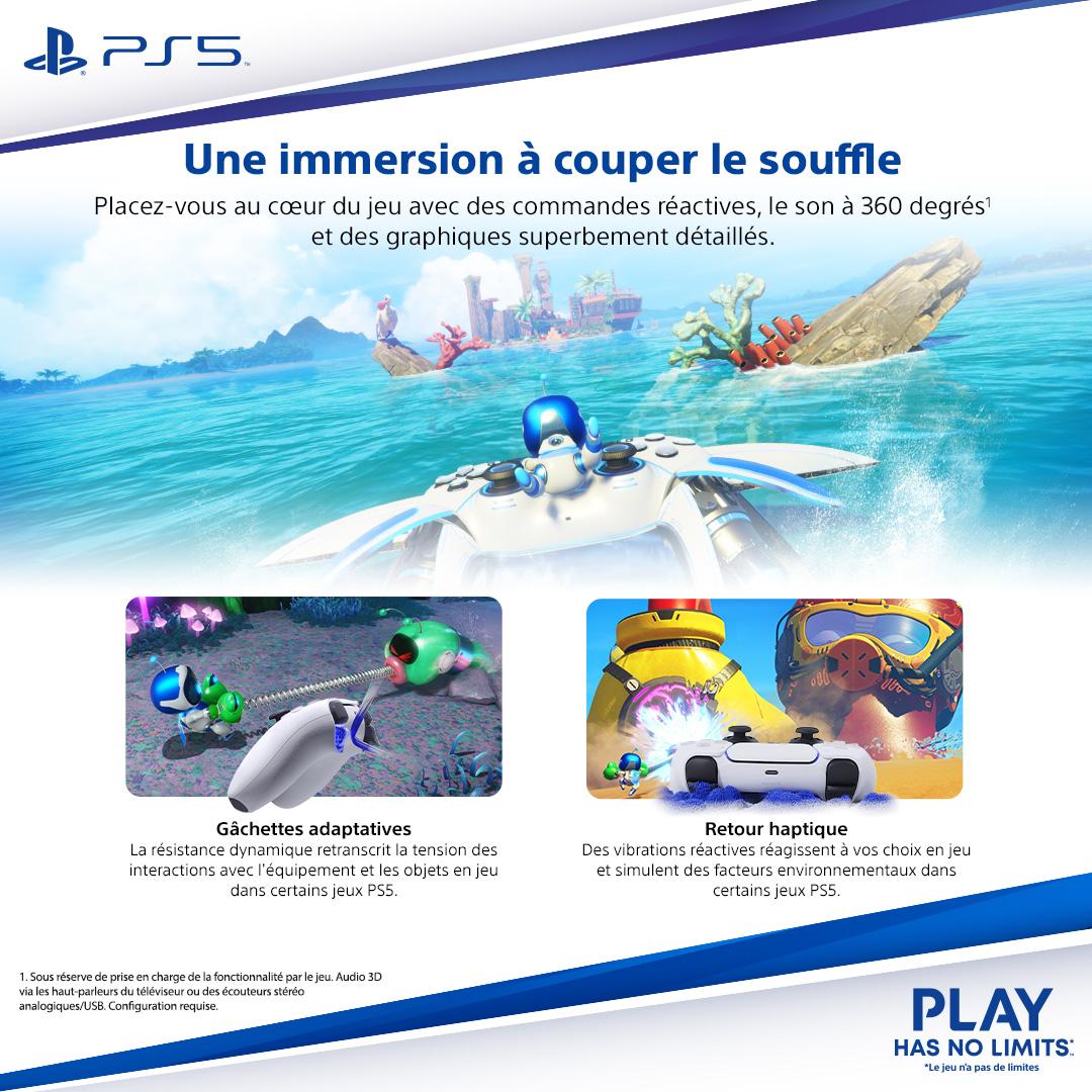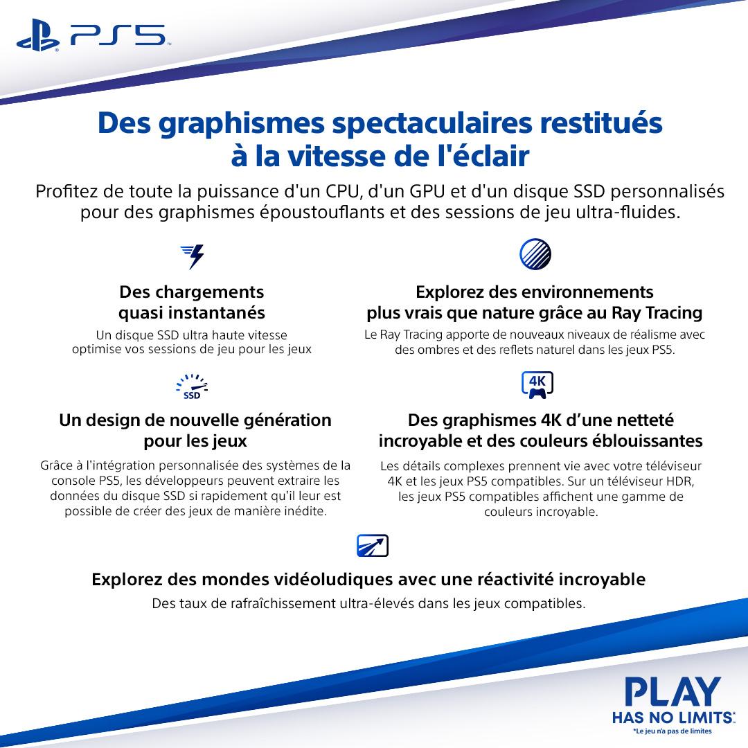 | Plus produit | Format slim (fin) avec lecteur Blu-ray; SSD ultra haute vitesse 1 To; Retour tactile et gâchettes adaptatives; Tempest 3D Audio Tech; Rétrocompatibilité PS4 (>4000 jeux); HDMI 2.1, Wi‑Fi 6, Bluetooth 5.1 |