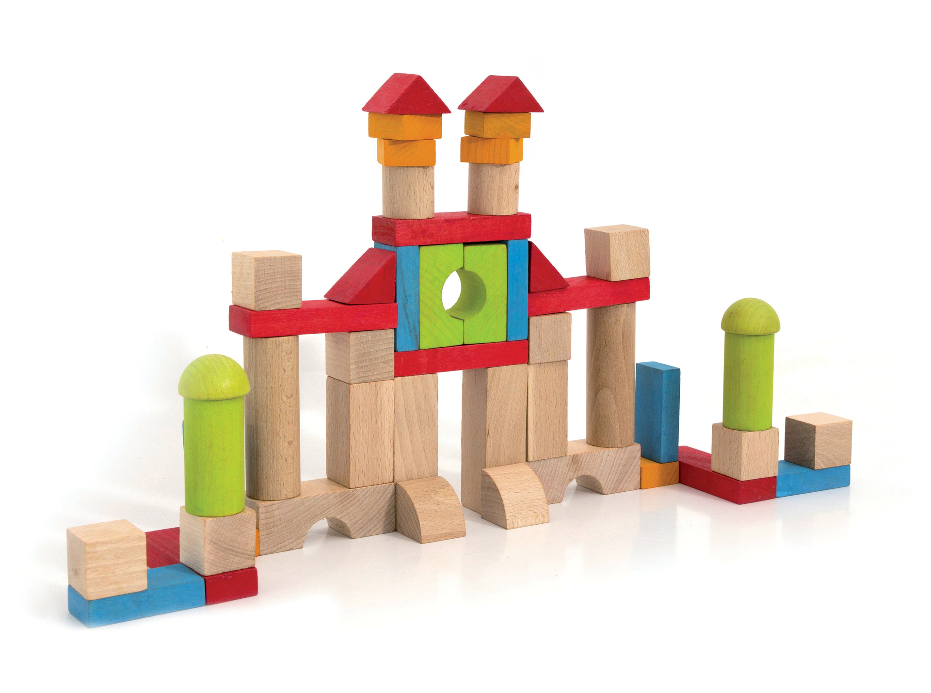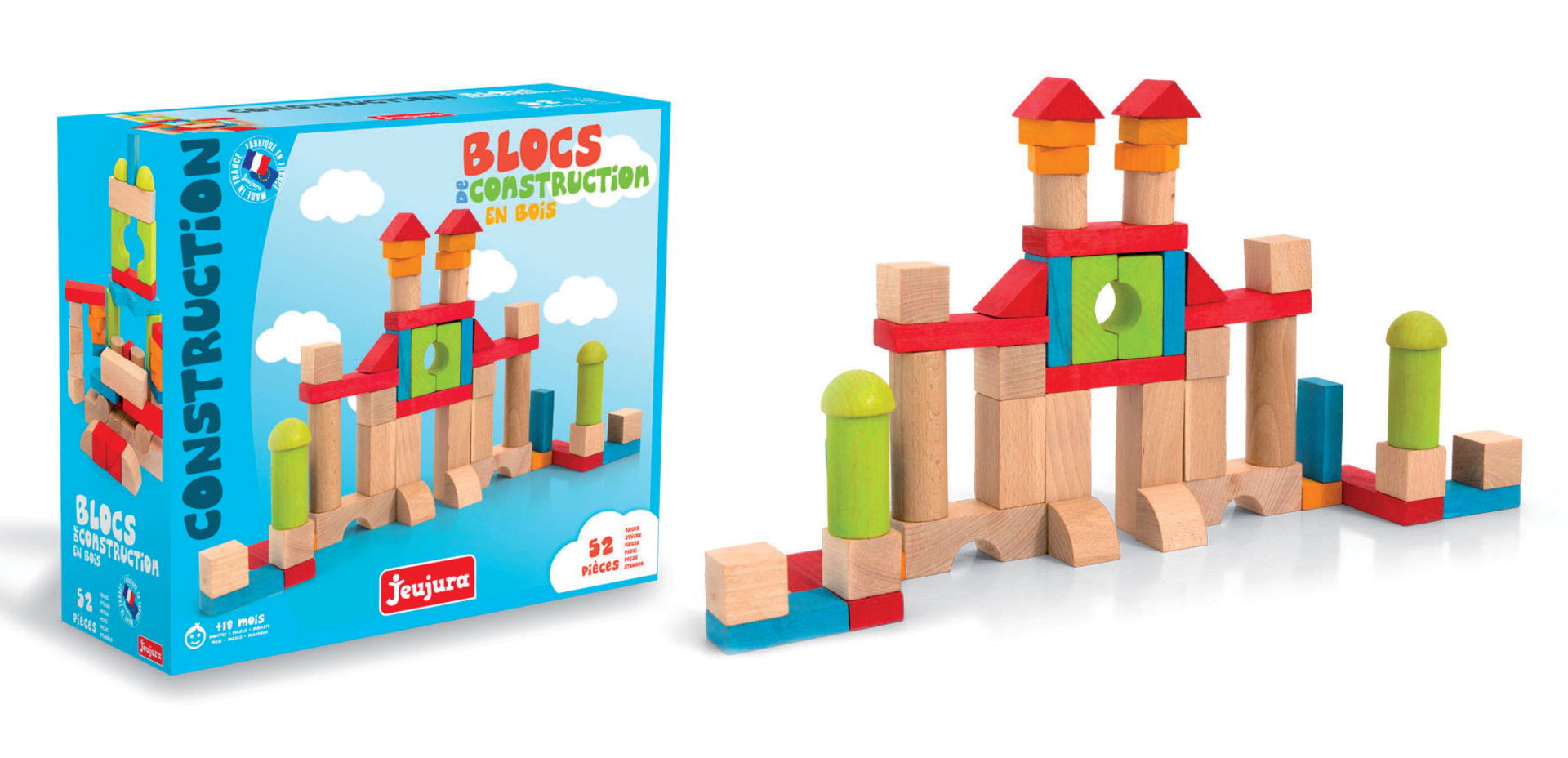 Construire - Blocs de Construction – 52 pièces en bois : Jeu de construction de 52 pièces en hêtre massif dans une valisette de rangement pratique, pour réaliser de nombreuses constructions toutes les plus créatives et imaginatives les unes que les autres. Valisette 26 x 24 x 9 cm. A partir de 18 mois.