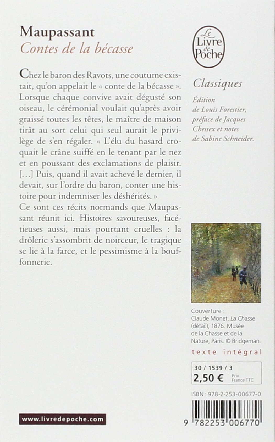Chez le baron des Ravots, une coutume existait, qu'on appelait le «conte de la bécasse». Lorsque chaque convive avait dégusté son oiseau, le cérémonial voulait qu'après avoir graissé toutes les têtes, le maître de maison tirât au sort celui qui seul aurait le privilège de s'en régaler. «L'élu du hasard croquait le crâne suiffé en le tenant par le nez et en poussant des exclamations de plaisir. [...] Puis, quand il avait achevé le dernier, il devait, sur l'ordre du baron, conter une histoire pour indemniser les déshérités.»