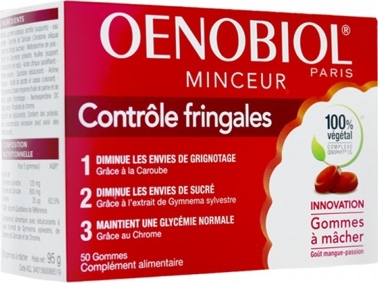 Oenobiol Minceur Contrôle Fringales 50 Gommes à Mâcher est un complément alimentaire avec édulcorants, sous forme de gommes à mâcher, à base d'extrait de Gymnema Sylvestre, de Gomme de Caroube et de Chrome. Ces gommes contiennent une formule innovante à base de 3 actifs qui aident à diminuer la sensation de faim et les envies de grignotage grâce à la Caroube et diminuer les envies de sucré grâce à l'extrait de Gymnema Sylvestre. Ils permettent également à maintenir une glycémie normale grâce au Chrome. Ce complément alimentaire vous permettra de contrôler efficacement votre poids en accompagnement de mesures diététiques.