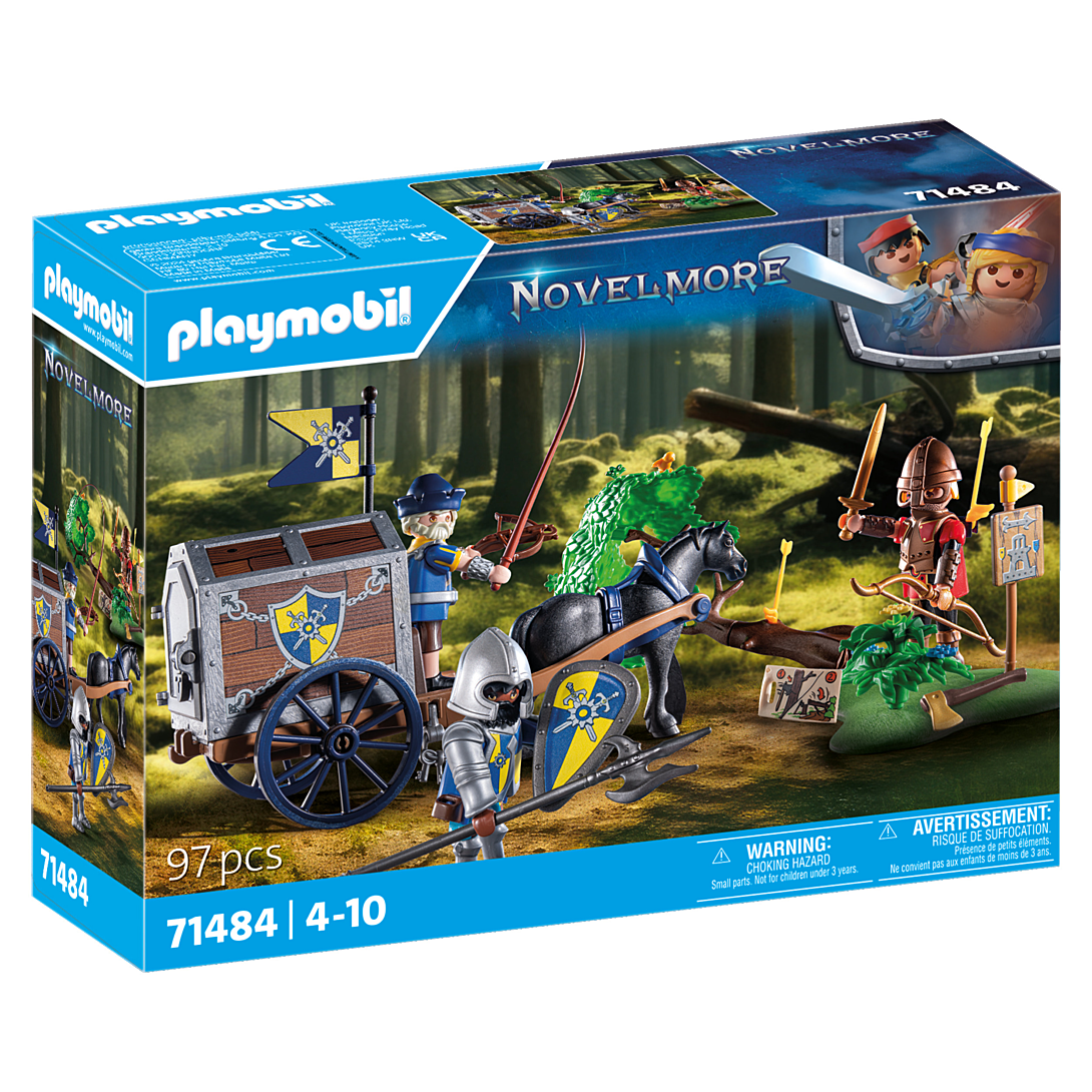 Entrez dans le monde d'aventure de Novelmore et vivez des aventures chevaleresques palpitantes avec le coffret PLAYMOBIL "Convoi de Novelmore avec bandit". Avec leur chariot de transport, les chevaliers de Novelmore ont des plans secrets, mais aussi de l'or du dragon chargé. Les Burnham Raiders ont en ligne de mire cette précieuse cargaison et ont abattu un arbre pour arrêter le wagon de transport. Pourtant, les chevaliers Novelmore feront tout pour défendre leurs biens. Ce set comprend trois personnages PLAYMOBIL, un cheval, une plaque de base avec un arbre inclinable, un arc et des flèches, de l'or, une arbalète et bien d'autres accessoires. Le coffre au trésor est stocké dans la structure. La structure peut être verrouillée avec une serrure. Le cheval peut être dételé et monté sans selle par un adulte.