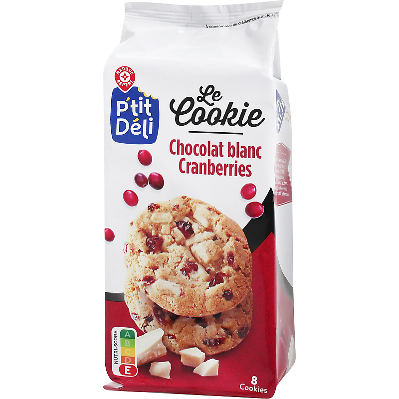 Cookies au chocolat blanc, aux raisins secs et aux canneberges séchées (cranberries), aromatisés. P'TIT DELI