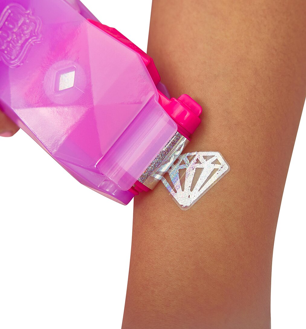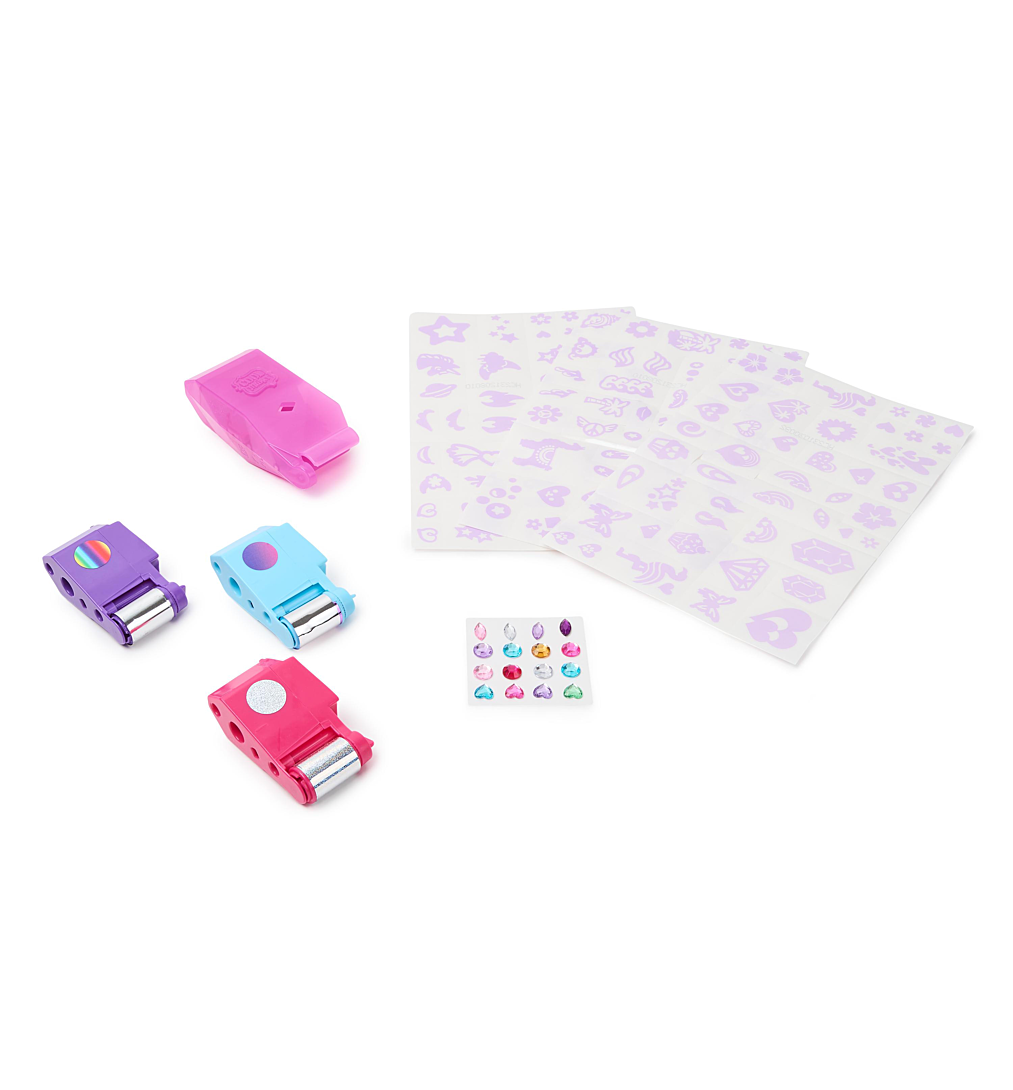 Compose ton tatouage en assemblant plusieurs motifs, révèle-le en appliquant de la couleur métallisée grâce au roller et ajoute ensuite des strass. Possibilité de réaliser jusqu'à 135 tatouages. Dès 7 ans.