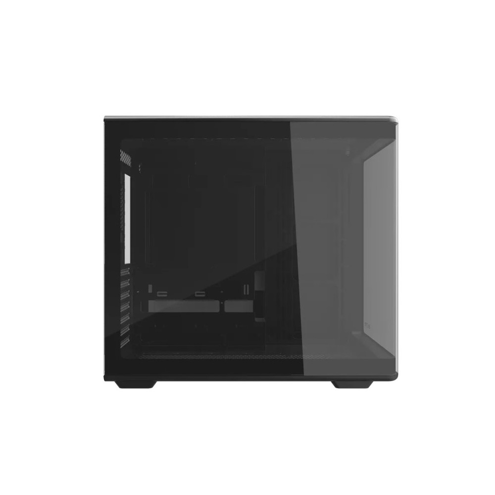 Châssis en acier SPCC avec panneaux en verre trempé teinté à l'avant et sur le côté, finition noir mat et verre brillant teinté.