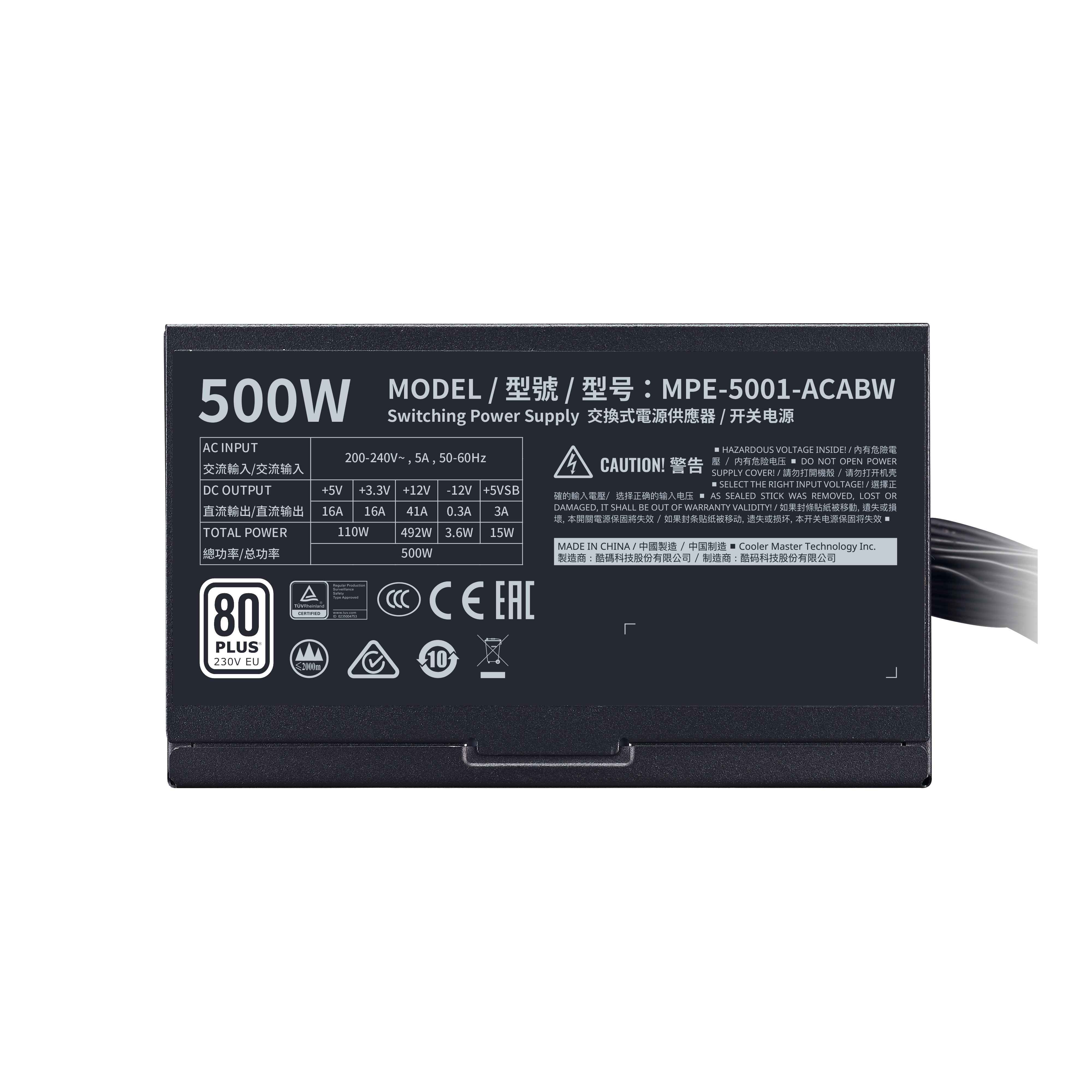 Cooler Master MWE 500 White 230V - V2. Puissance totale: 500 W, Tension d'entrée AC: 200 - 240 V, Fréquence d'entrée AC: 50 - 60 Hz. Connecteur de la carte mère: 24-pin ATX, Longueur de câble d'alimentation de carte-mère: 50 cm, Longueur du câble d'alimentation SATA: 400,550,700 mm. Utilité: PC, Facteur de forme de l'unité d'alimentation: ATX, Certification 80 PLUS: 80 PLUS. Couleur du produit: Noir, Type de refroidissement: Actif, Diamètre du ventilateur: 12 cm. Largeur: 140 mm, Profondeur: 86 mm, Hauteur: 150 mm