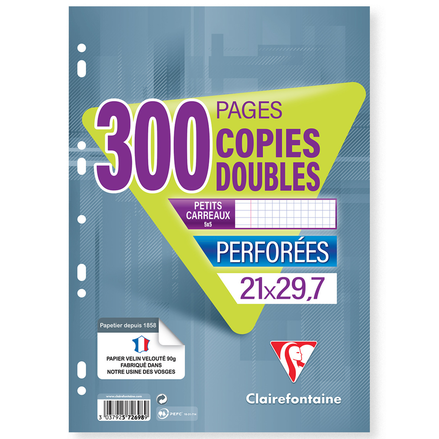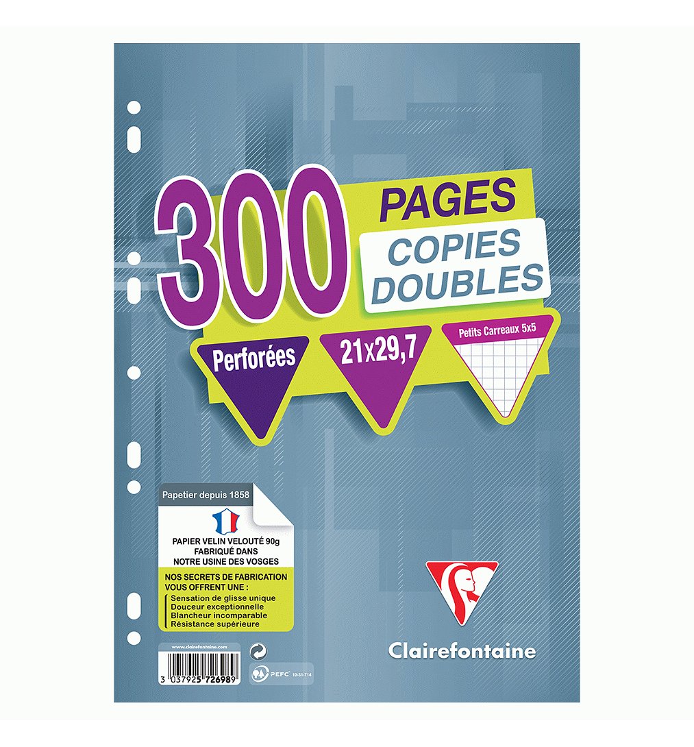 | Libellé | Copies Doubles Blanches Perforees 210X297 300 Pages 5X5 Arrete+Marge Papier P.E.F.C. 90G Sous Film Avec Encart Clairefontaine |