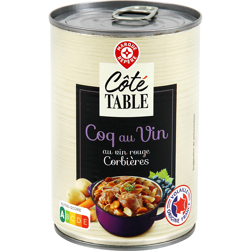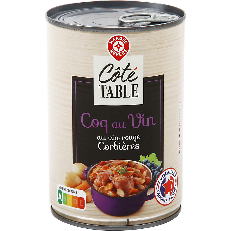 Ingrédients: Morceaux de cuisses de poulet non désossés saumurés et précuits 35 % (morceaux de cuisses de poulet non désossés ; eau ; sel) ; pommes de terre 23 % (dont conservateur : disulfite de sodium) ; eau ; vin rouge Corbières 7,6 % (dont sulfites) ; carottes 6,2 % ; champignons de Paris ; oignons ; double concentré de tomates ; amidon modifié de maïs ; colorant : caramel ordinaire ; cacao maigre en poudre ; arômes naturels (dont lait) ; gélifiants : gomme guar, gomme xanthane ; sucre ; poivre blanc ; arôme naturel d'ail ; arôme naturel de thym ; arôme naturel de laurier.