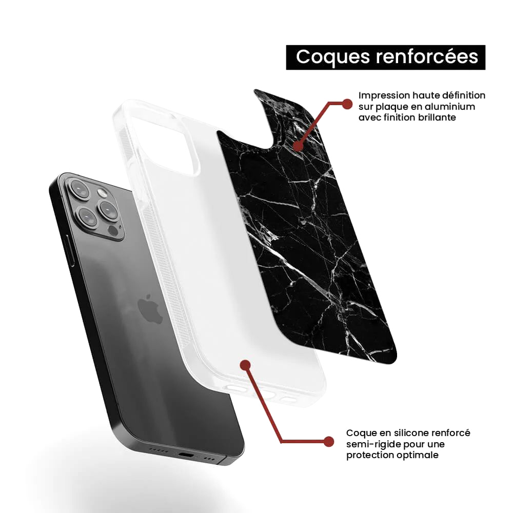 Coque silicone renforcé pour Apple iPhone 11 – Impression photo HD sur plaque métal – Protection antichoc en silicone TPU souple. Protégez et personnalisez votre smartphone avec cette coque de qualité supérieure, conçue spécialement pour le modèle Apple iPhone 11. Grâce à son impression par sublimation sur plaque métal, le visuel marbre noir ressort avec une qualité photo exceptionnelle, pour un rendu haut de gamme et durable. Coque ajustée sur-mesure : compatible Apple iPhone 11 – accès total aux boutons, connecteurs et recharge sans fil. Impression brillante sur métal : design ultra net, couleurs éclatantes, résistantes à l’usure. Protection renforcée : silicone TPU absorbant les chocs, bords surélevés pour écran et appareil photo. Installation facile : matière souple, se retire sans abîmer l’appareil. Produit imaginé et expédié depuis la France – fabrication rapide et SAV réactif. 1001 Coques, expert de la personnalisation mobile, vous propose des protections de qualité professionnelle pour sublimer et sécuriser votre téléphone