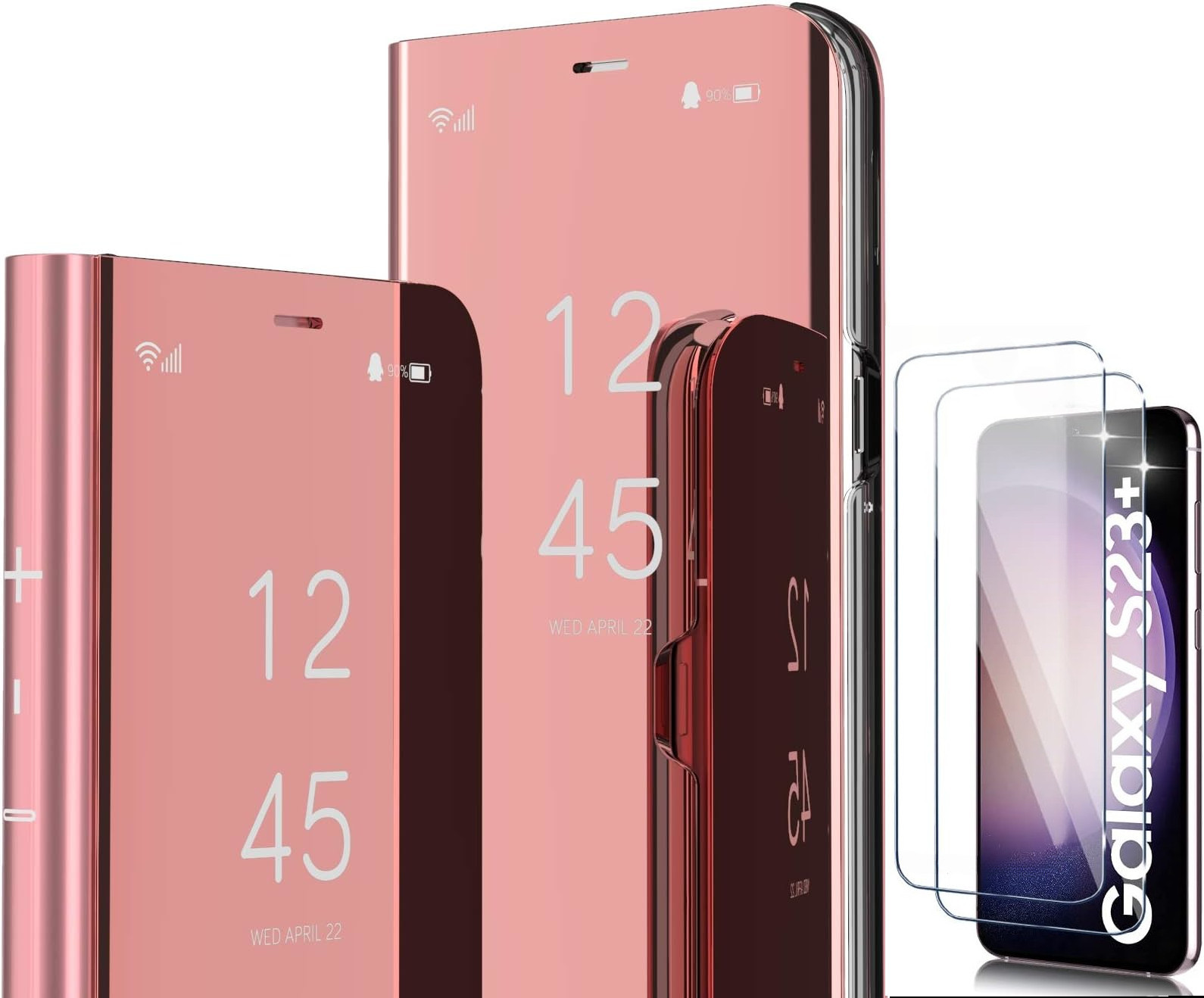 Coque Folio Rabat Miroir Pour Samsung Galaxy S23 Plus Couleur Rose + 2 Verres Trempe Protection Ecran Lit