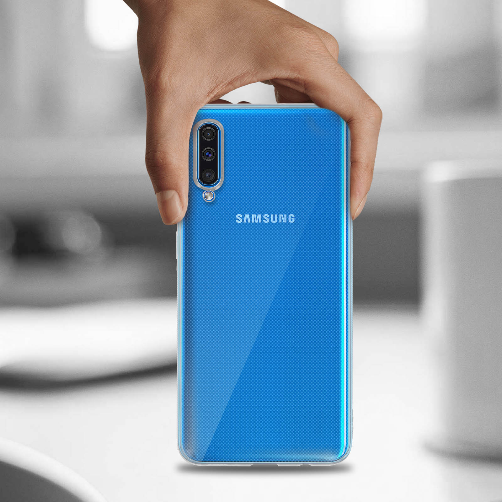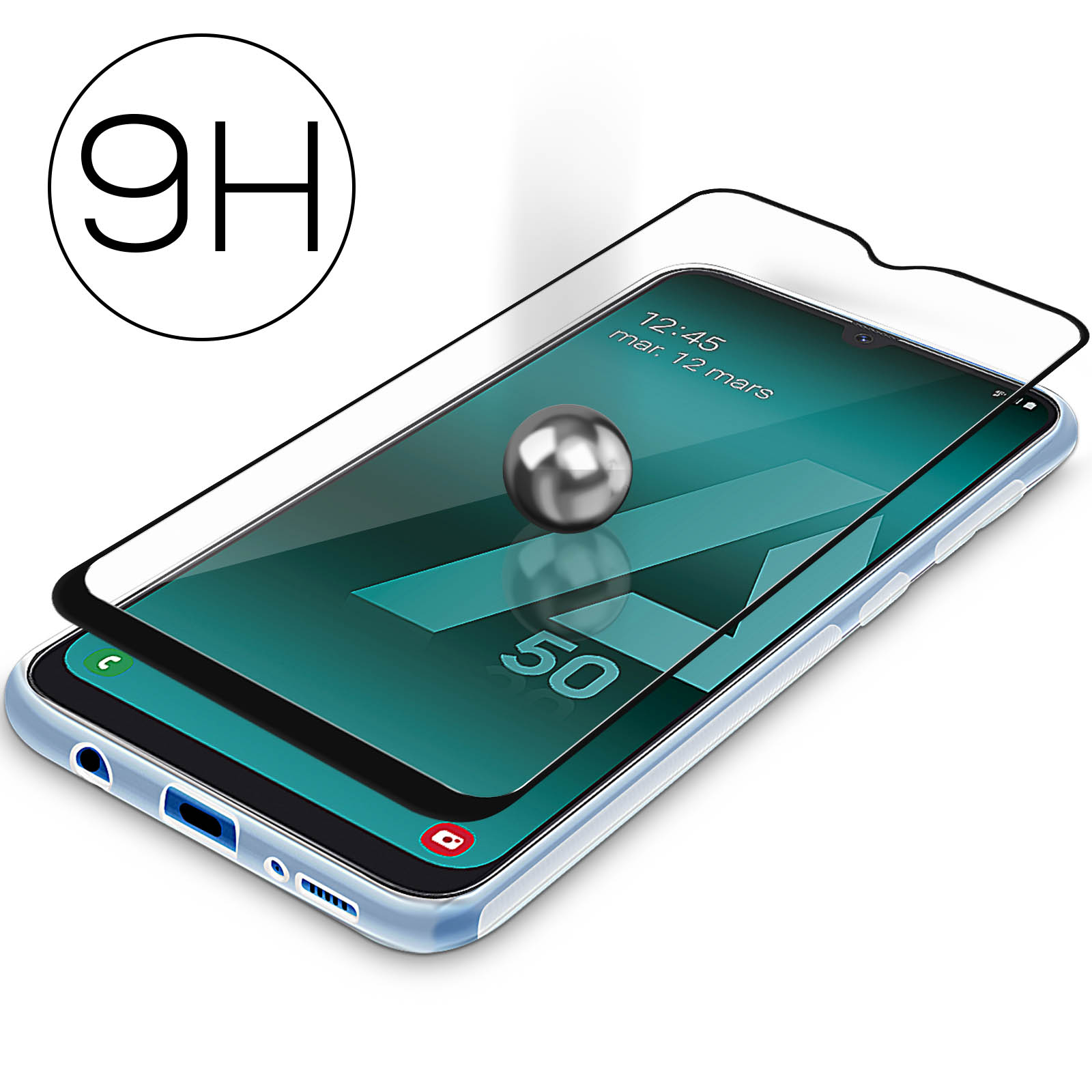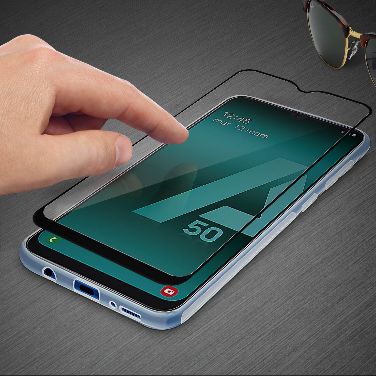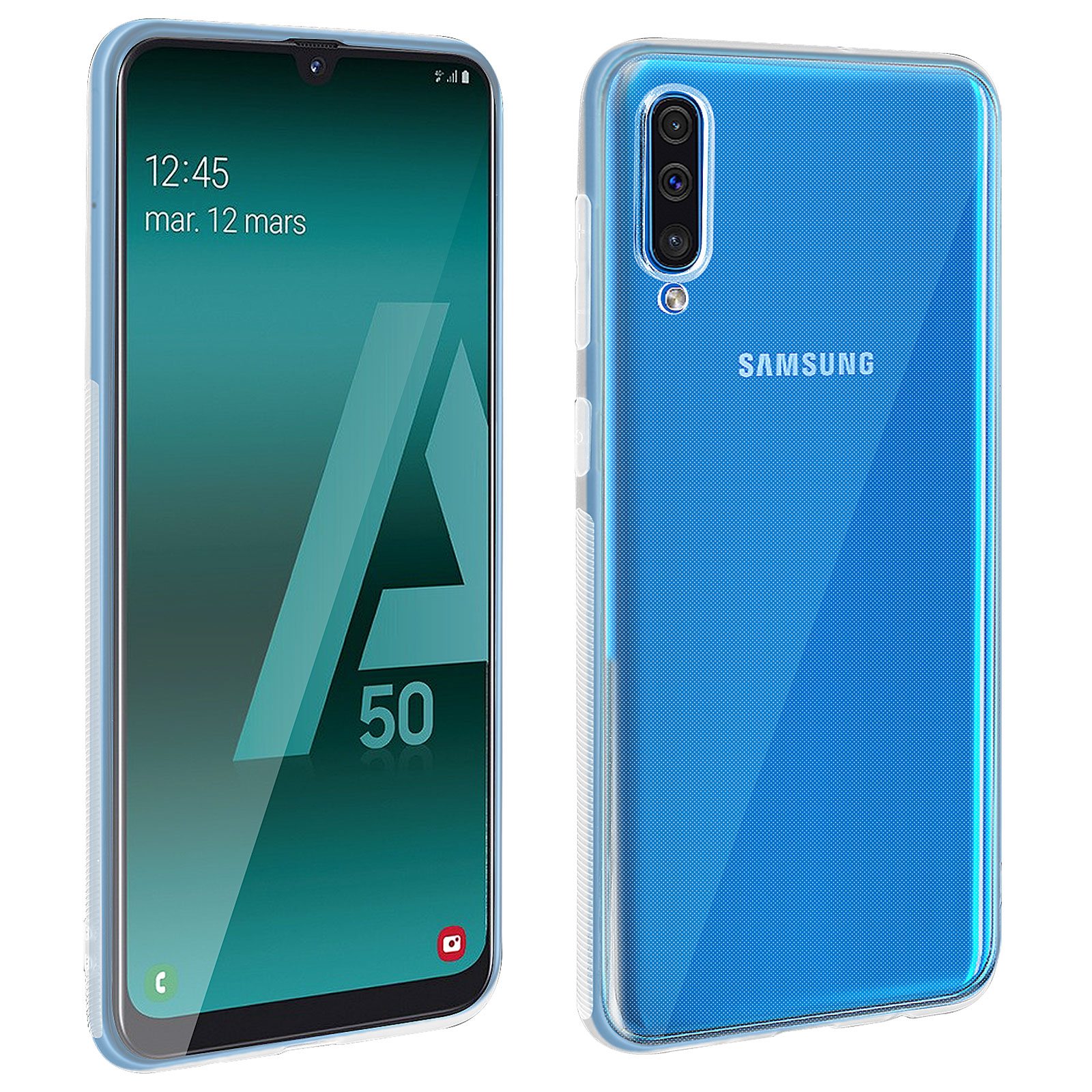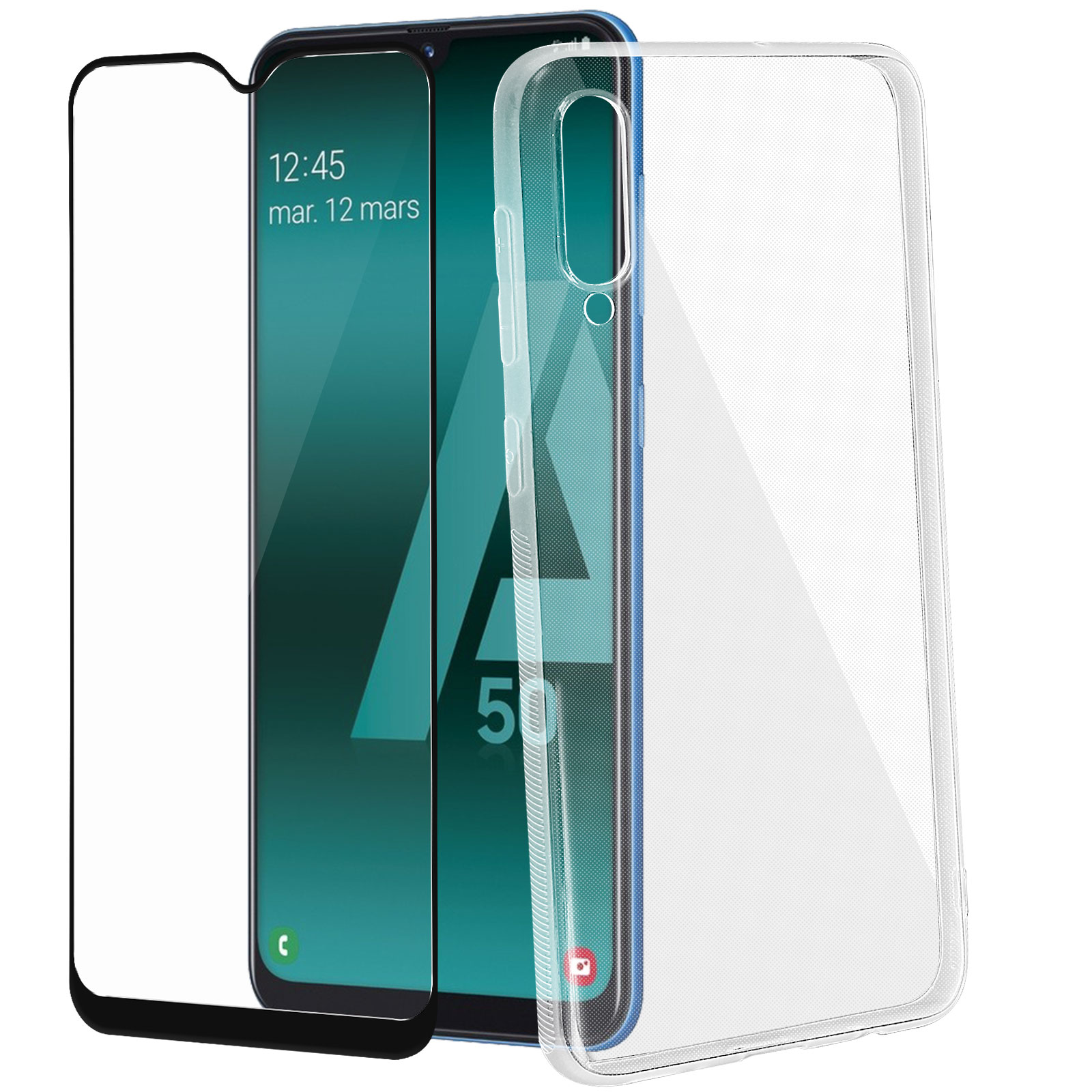 Pack protection Samsung Galaxy A50. Coque transparente en silicone gel qui protège des chocs et des rayures tout en laissant le mobile visible. Film protège écran en verre trempé ultra-résistant aux contours colorés. Fonctionnalités accessibles.