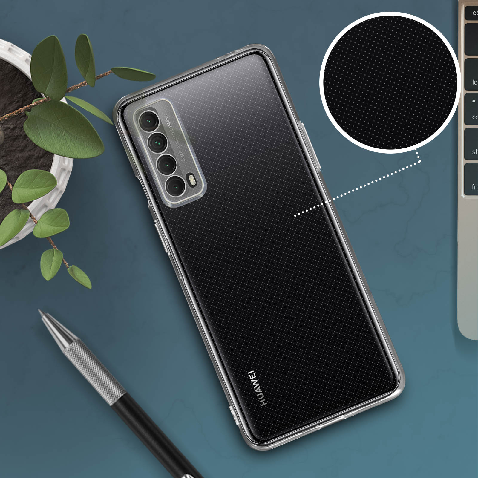 Pack protection Huawei P smart 2021. Coque transparente en silicone souple qui protège des chocs et rayures, tout en laissant le design du mobile visible. Film écran en verre trempé 9H ultra-résistant. Fonctionnalités accessibles.