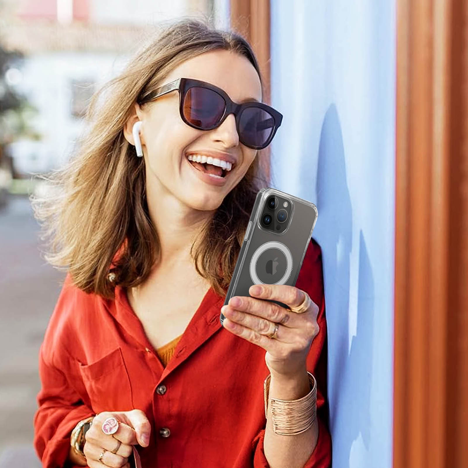 Coque pour iPhone 14 Pro Max. Compatible avec chargeur, support, porte-carte Magsafe. Hybride en polycarbonate et en silicone gel avec coins renforcés. Bords de écran et de la caméra surélevés de 1mm. Fonctions accessibles. Attache dragonne intégrée.