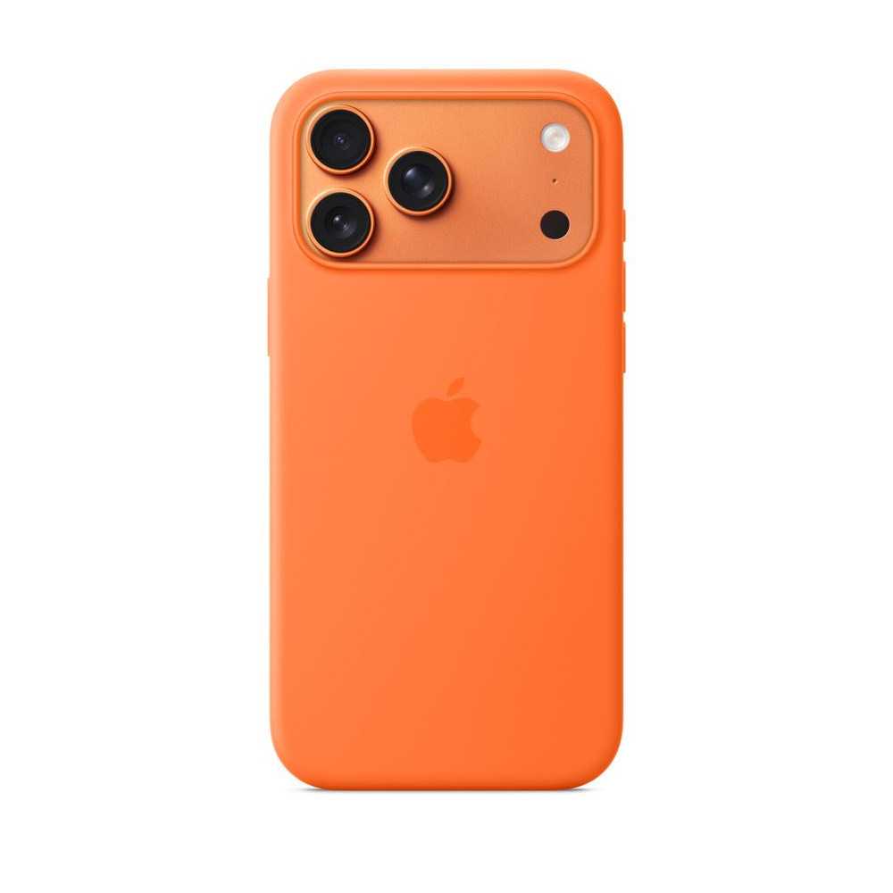 Coque en silicone soft-touch pour iPhone 17 Pro Max (17,5 cm) avec finition mate, couleur orange.