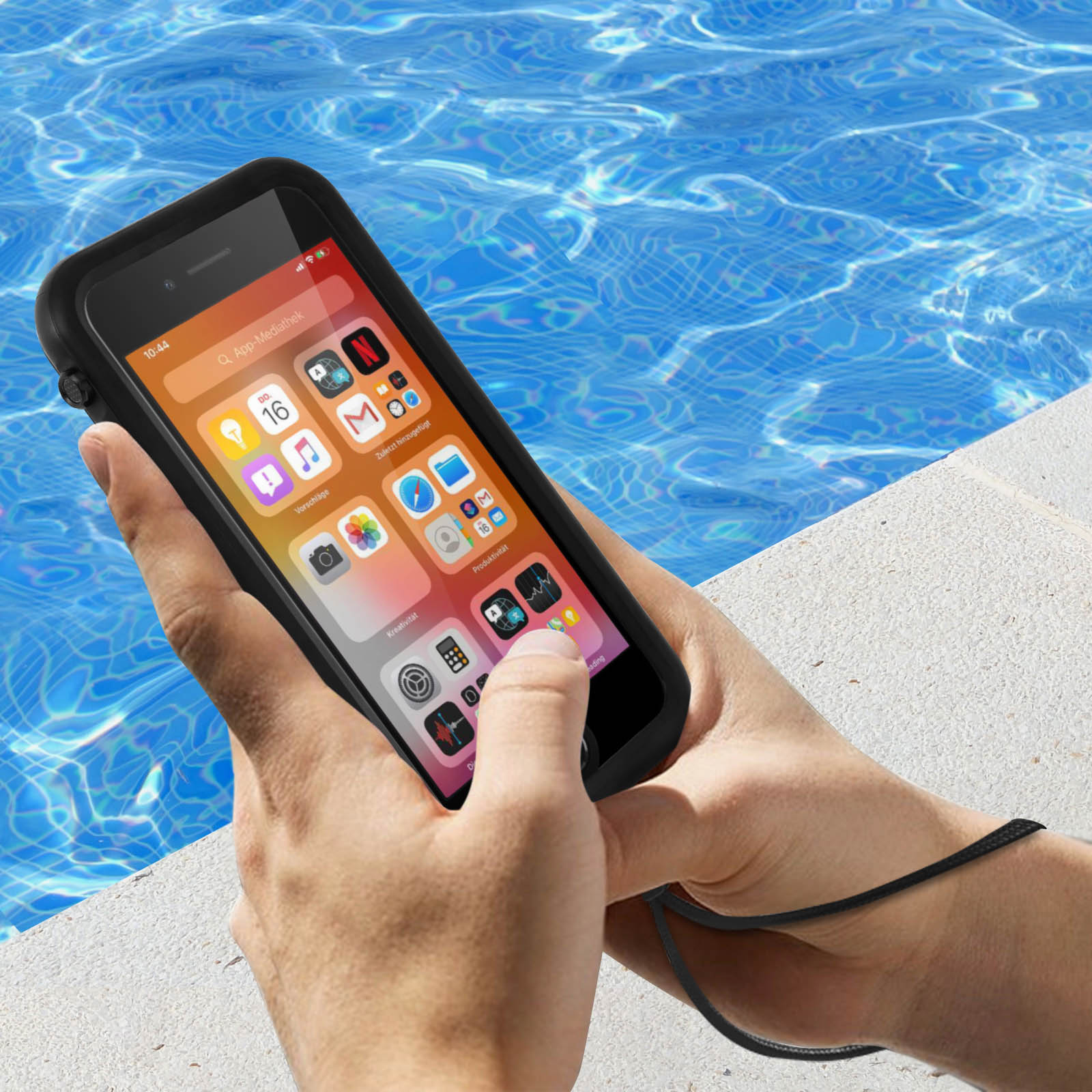 Coque iPhone SE 2022, 2020 et iPhone 8, 7. Protection intégrale avec vitre écran tactile transparente. Revêtement rigide ultra-robuste. Entièrement étanche résistante à une immersion jusqu'à 2m de profondeur. Compatible chargeur sans-fil. Dragonne incluse