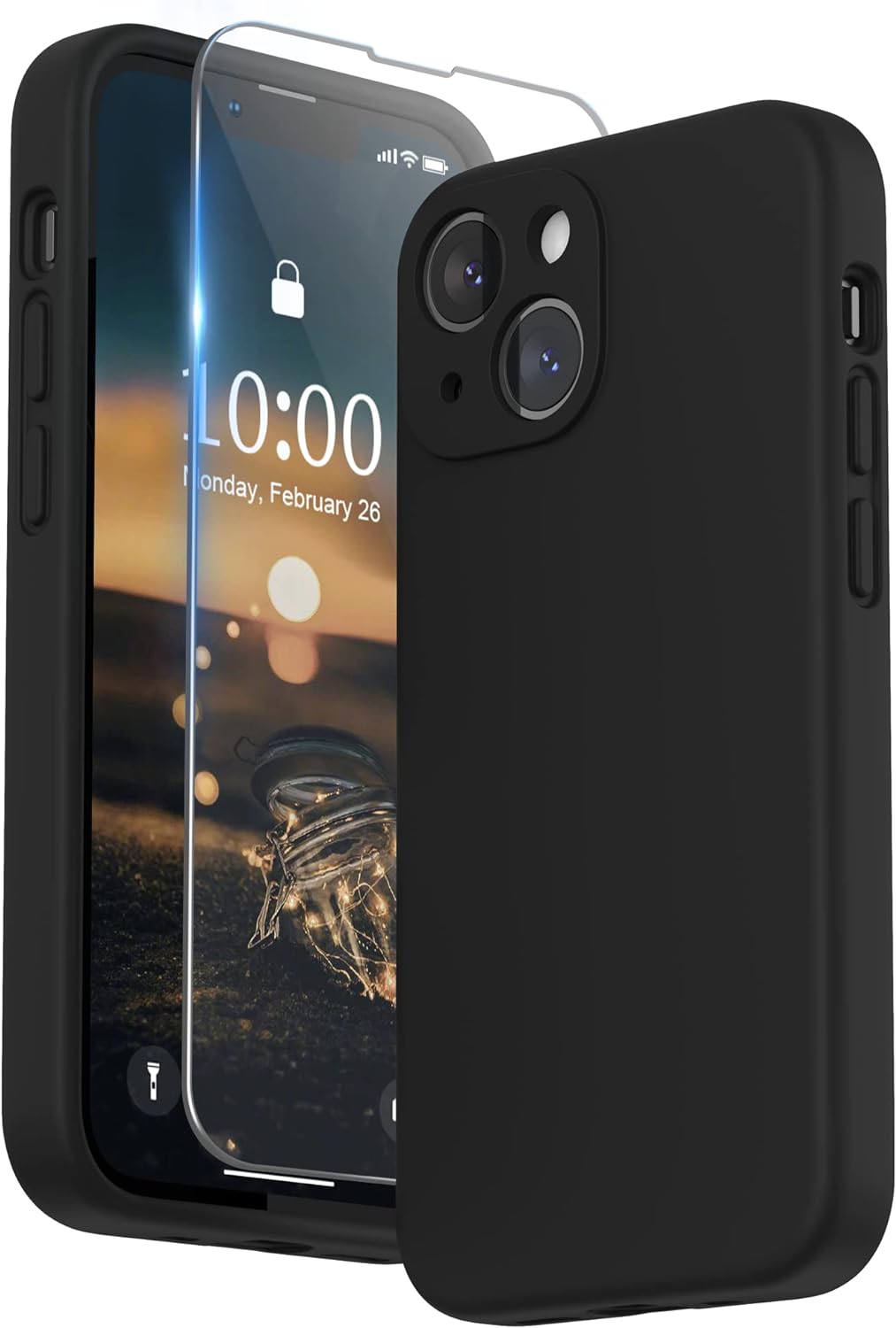Compatible avec iPhone 13 Mini (écran 5,4 pouces). Pack de 1 Coque arrière en silicone souple Noire + Verre Trempé avec Lingette nettoyante.