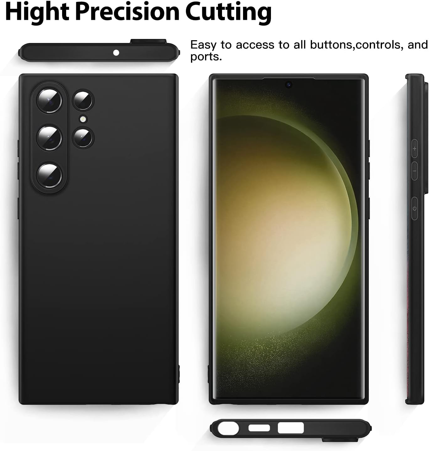 Compatible avec Samsung Galaxy S23 Ultra (écran 6,8 pouces). Pack de 1 Coque arrière en silicone souple Noire + Verre Trempé avec Lingette nettoyante.