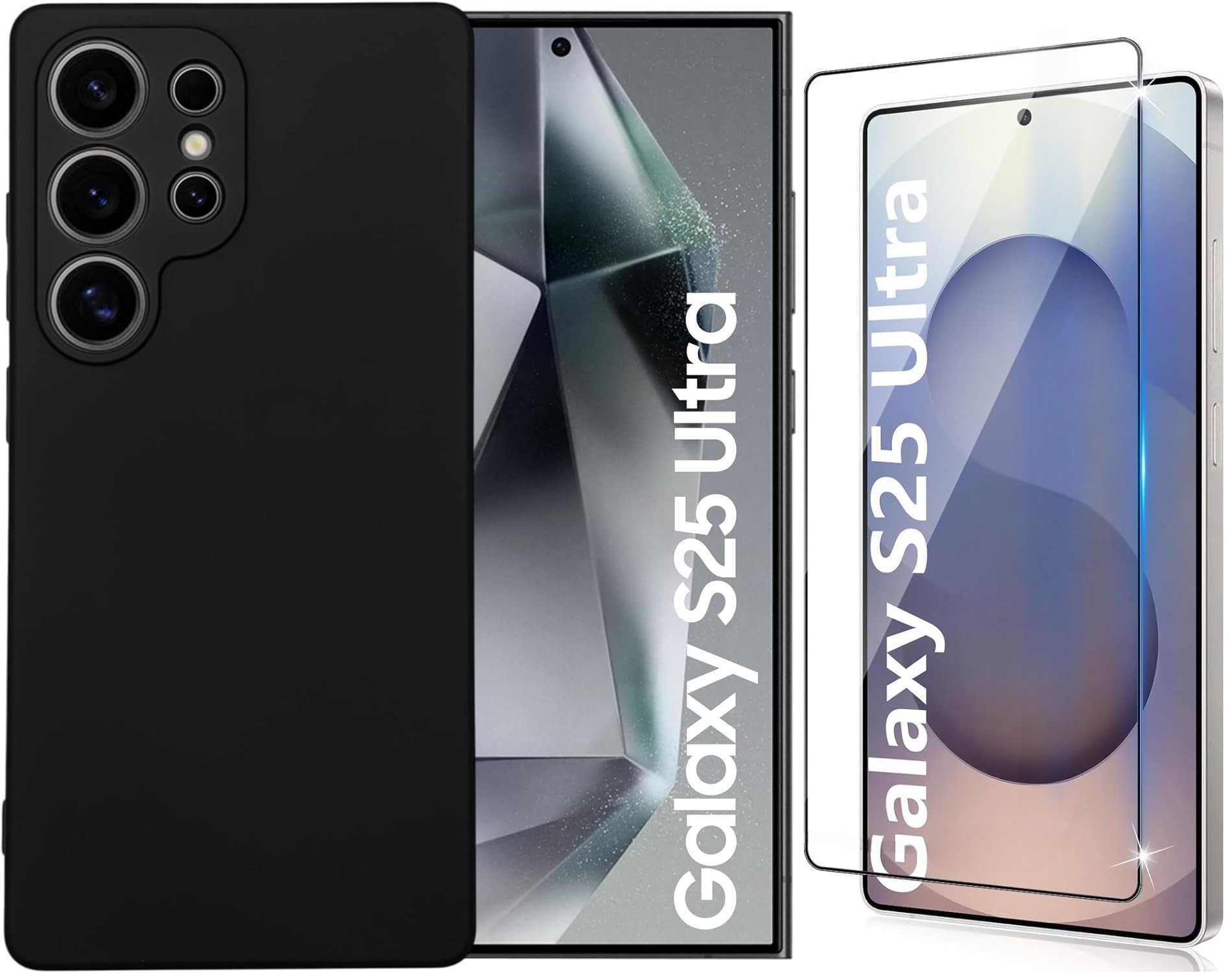 Compatible avec Samsung Galaxy S25 Ultra (Ecran 6,8 pouces). Pack Coque arriere en silicone souple Noir + Protection Ecran Verre avec Lingette nettoyante.