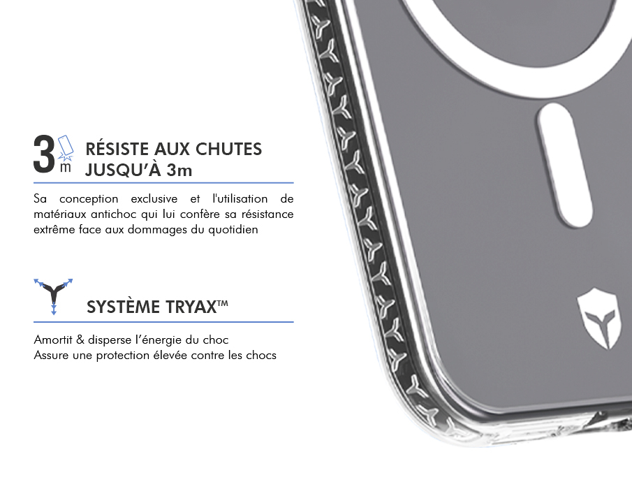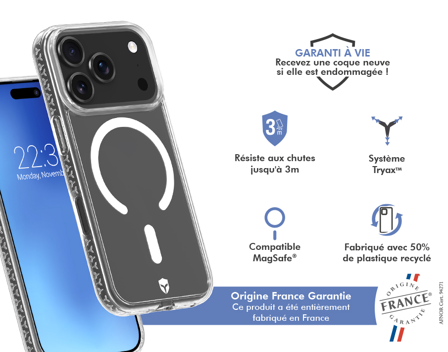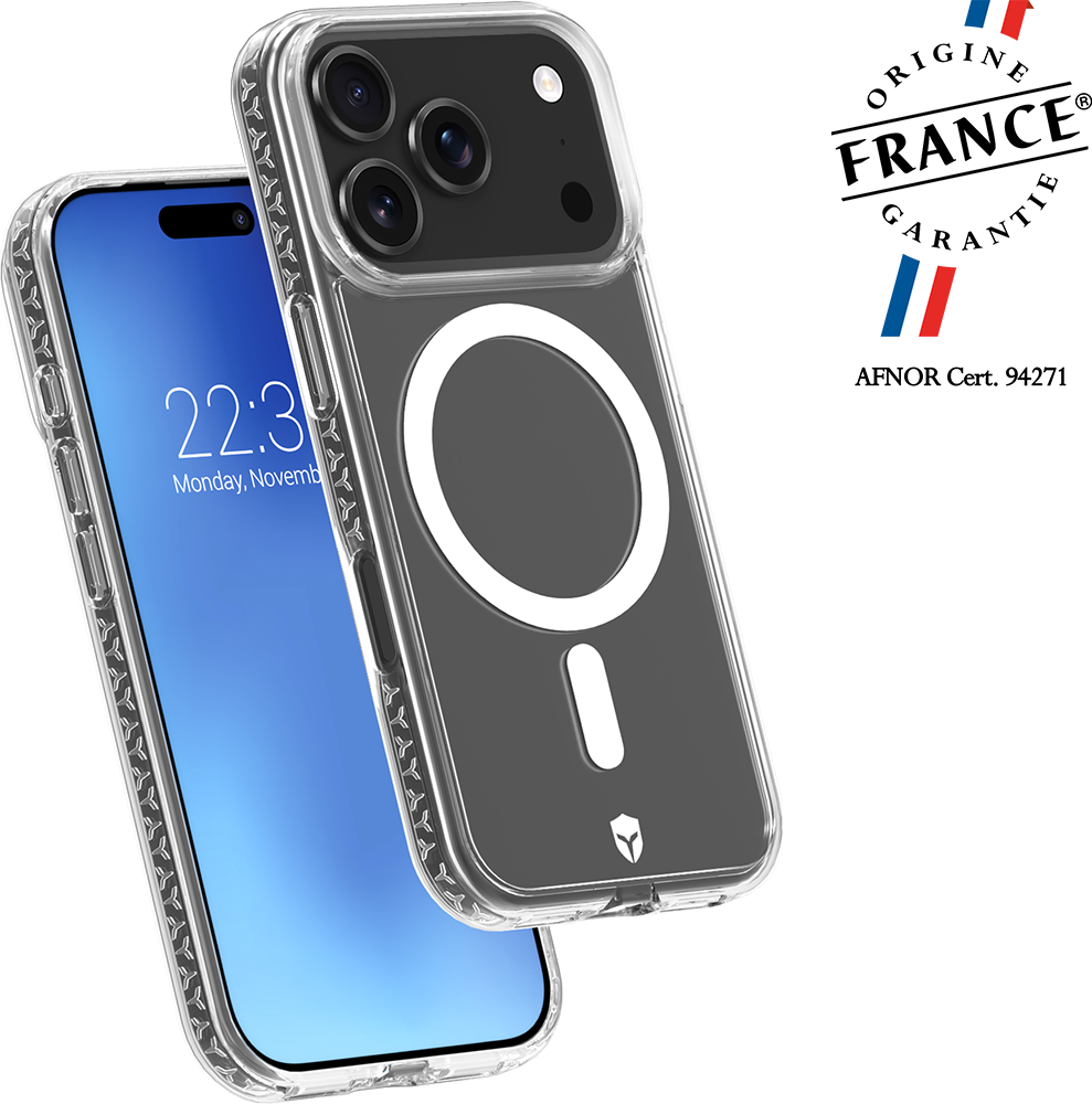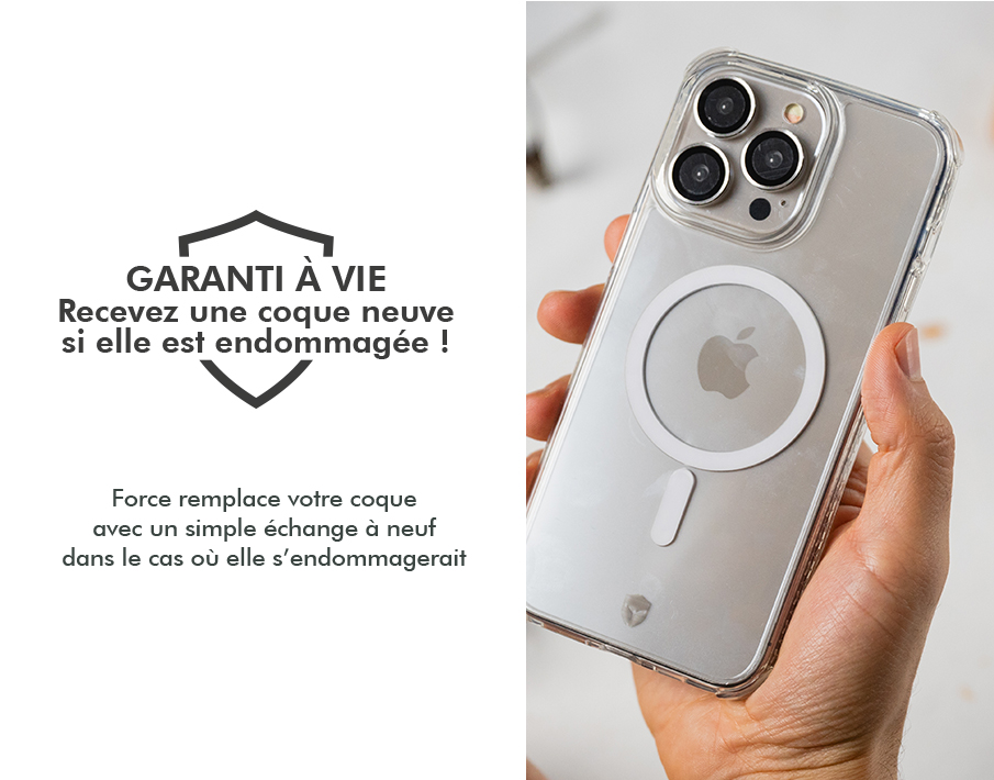 Résiste aux chocs et aux chutes de 3 mètres. Alliant finesse et robustesse, elle a été réalisée à partir de matériaux de choix. C'est la combinaison de 2 technologies exclusives qui lui confère sa résistance extrême face aux dommages du quotidien. Technologie Air Cushion Les coins de la coque renforcés de cavités d'air sont capables d'amortir l'impact sans endommager le mobile. Système Tryax Inserts 3D Ce système présent sur le contour de la coque est conçu pour absorber les impacts et disperser l'énergie du choc selon trois axes. Votre mobile est ainsi protégé de tous les côtés. Contours surélevés protecteurs Les bords ainsi que les contours de la caméra sont renforcés en silicone liquide pour une protection intégrale. Vous pourrez ainsi poser votre smartphone sur la face avant ou arrière sans risque. Système aimanté renforcé compatible Magnet & MagSafe Grâce à la puissance de son système aimanté renforcé, vous pourrez fixer votre coque sur tous les accessoires magnétiques de l'écosystème Magnet & MagSafe : chargeur sans fil, support voiture, stand vidéo, etc... Efficacité de charge améliorée L'alignement magnétique optimal de ses aimants renforcés assure également que la charge de votre iPhone est plus efficace et donc plus rapide. Finition transparente élégante et design sur mesure Son design transparent soigné laisse apprécier la beauté originale de votre smartphone tout en vous garantissant la meilleure prise en main. Traitement spécial anti-jaunissement Fabriquée à partir d'un alliage de polymère traité contre le jaunissement, votre coque conservera sa transparence beaucoup plus longtemps. Origine France Garantie La certification Origine France Garantie, certifie que ce produit a été entièrement fabriqué en France : transformation et conditionnement. Compatible Force Glass Garantie à vie Recevez une coque neuve si elle est endommagée Un packaging éco conçu entièrement recyclable Carton (certifié issu d'une gestion responsable des forêts), de la colle (végétale) et de l'encre (de soja) Revalorisation des produits Renvoi prépayé des anciens produits à recycler pour favoriser l'économie circulaire