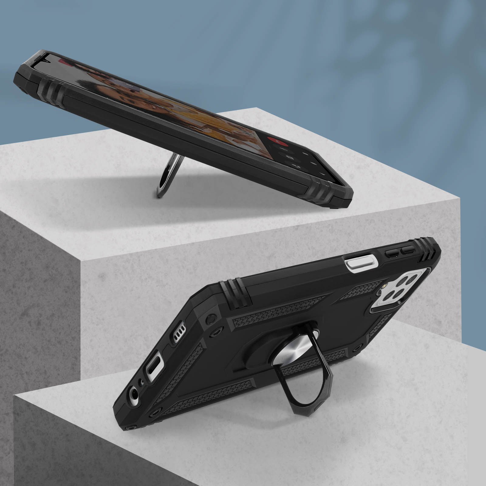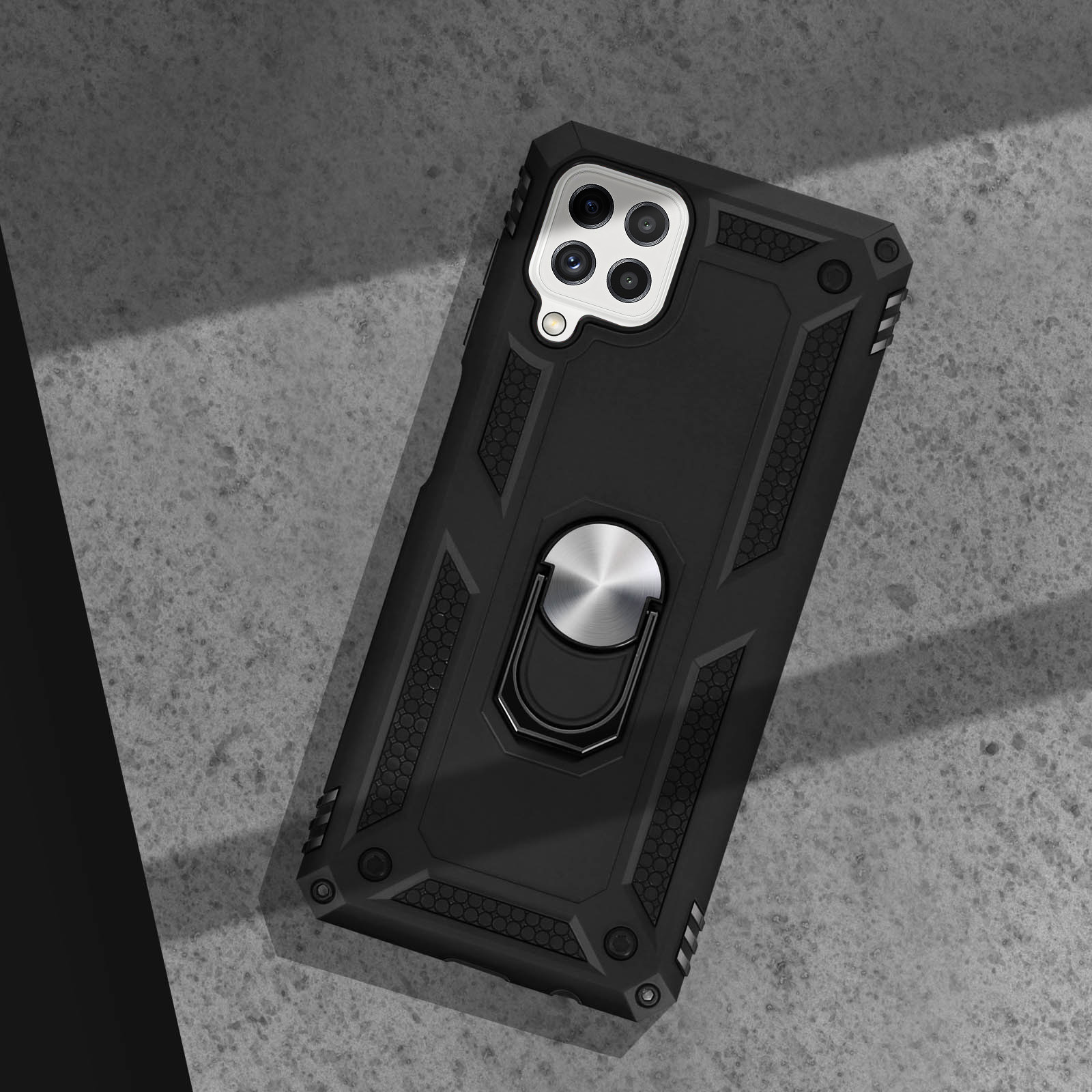 Coque antichoc bi-matière pour Samsung Galaxy A22, M32 et M22. Armature rigide et intérieur en silicone. Bague de maintien pouvant se transformer en support vidéo. Compatible avec un support magnétique. Fonctionnalités accessibles.