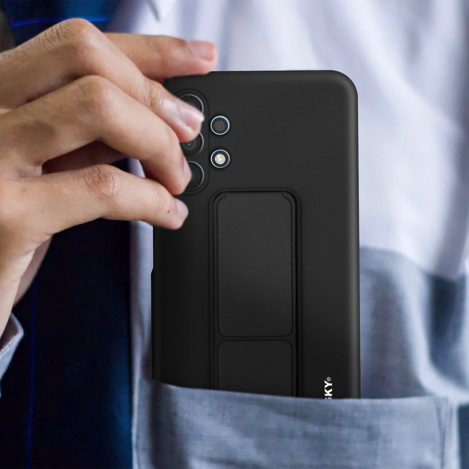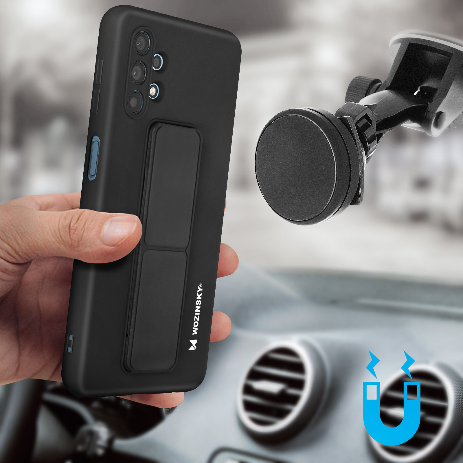 Coque de protection Samsung Galaxy A32 5G signée Wozinsky. En silicone souple antichoc et anti-rayures. Béquille pliable faisant office de support vidéo ou de poignée de maintien. Compatible support magnétique (non inclus). Fonctionnalités accessibles.