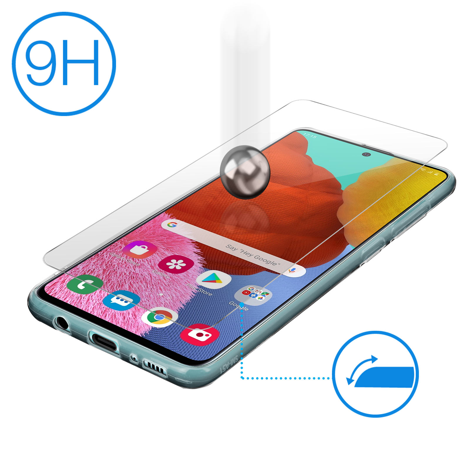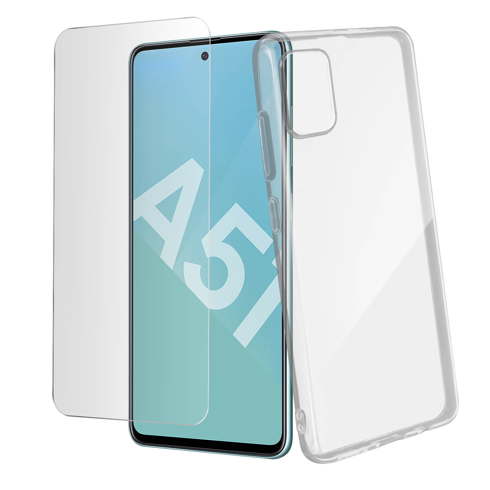 Pack protection Samsung Galaxy A51. Coque transparente en silicone gel qui protège des chocs et rayures tout en laissant le mobile visible. Film protège écran en verre trempé ultra-résistant. Fonctions accessibles.