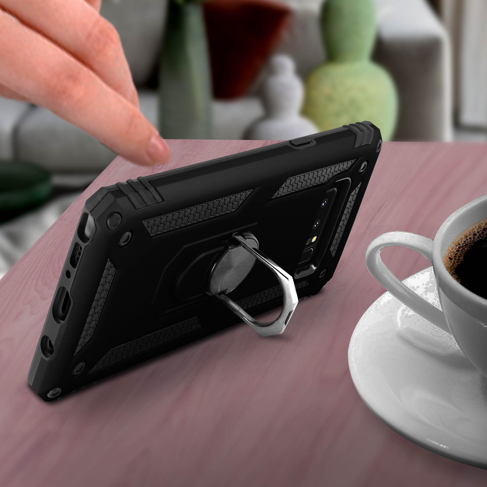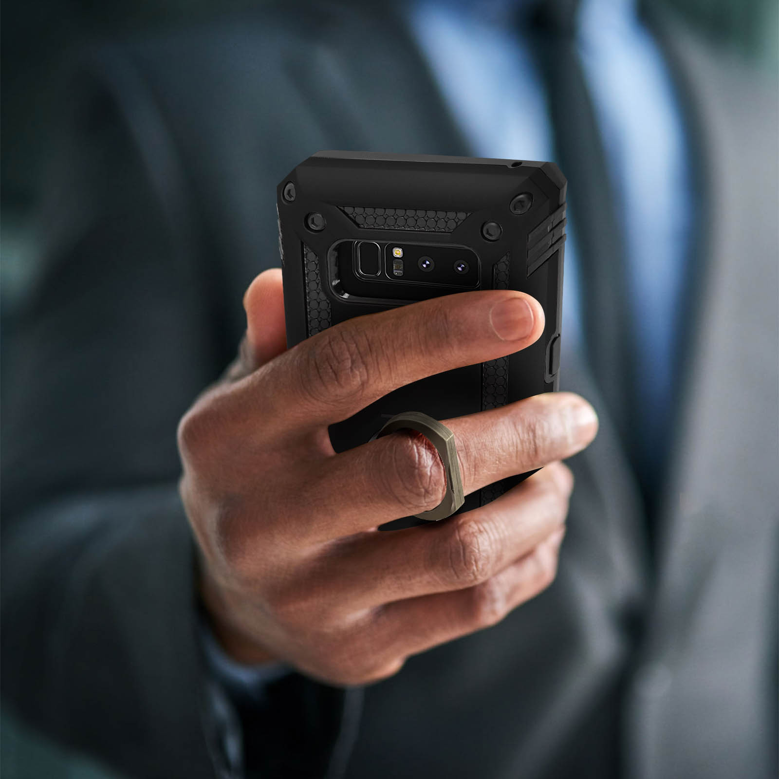 Coque bi-matières pour Samsung Galaxy Note 8. Armature rigide et intérieur en silicone souple. Bague de maintien pouvant se transformer en support vidéo. Compatible avec un support magnétique. Fonctions accessibles