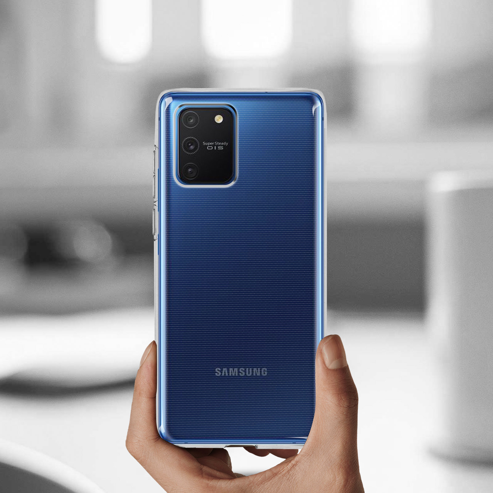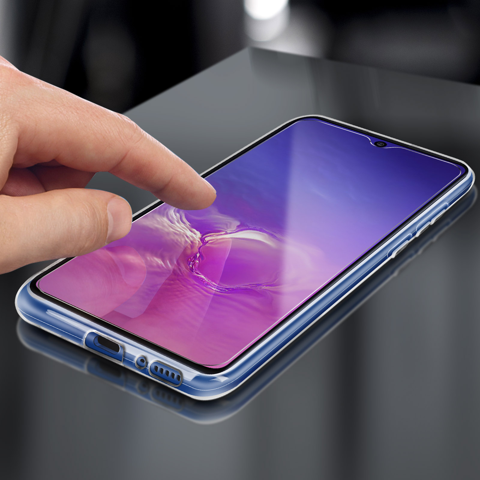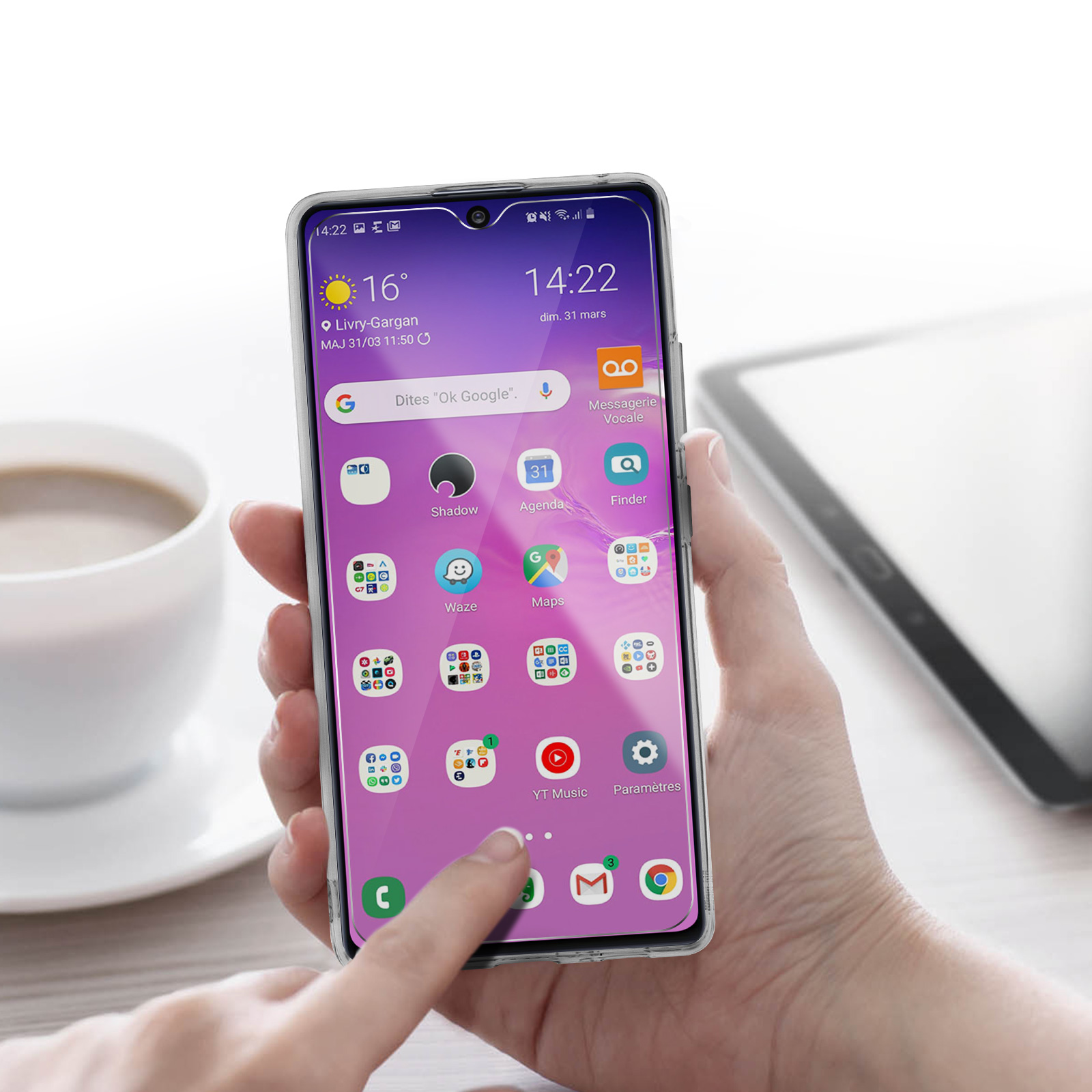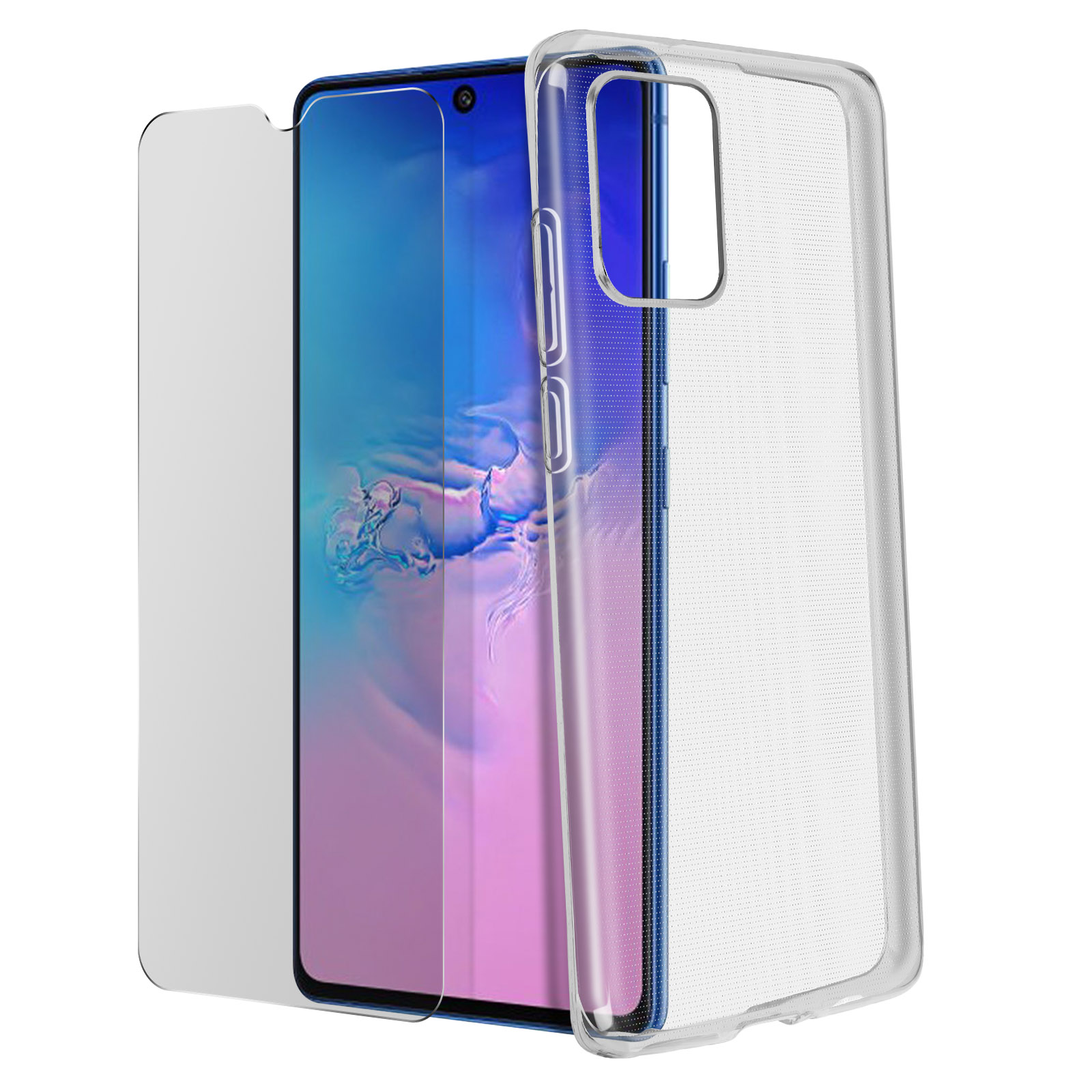 Pack protection Samsung Galaxy S10 Lite. Coque transparente en silicone gel qui protège des chocs et rayures tout en laissant le design du mobile visible. Film protège écran en verre trempé ultra-résistant. Bords Biseautés. Fonctions accessibles.