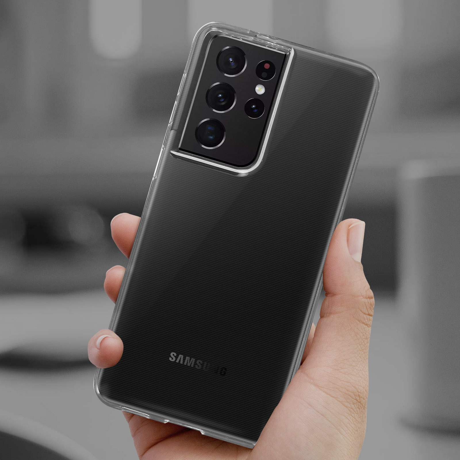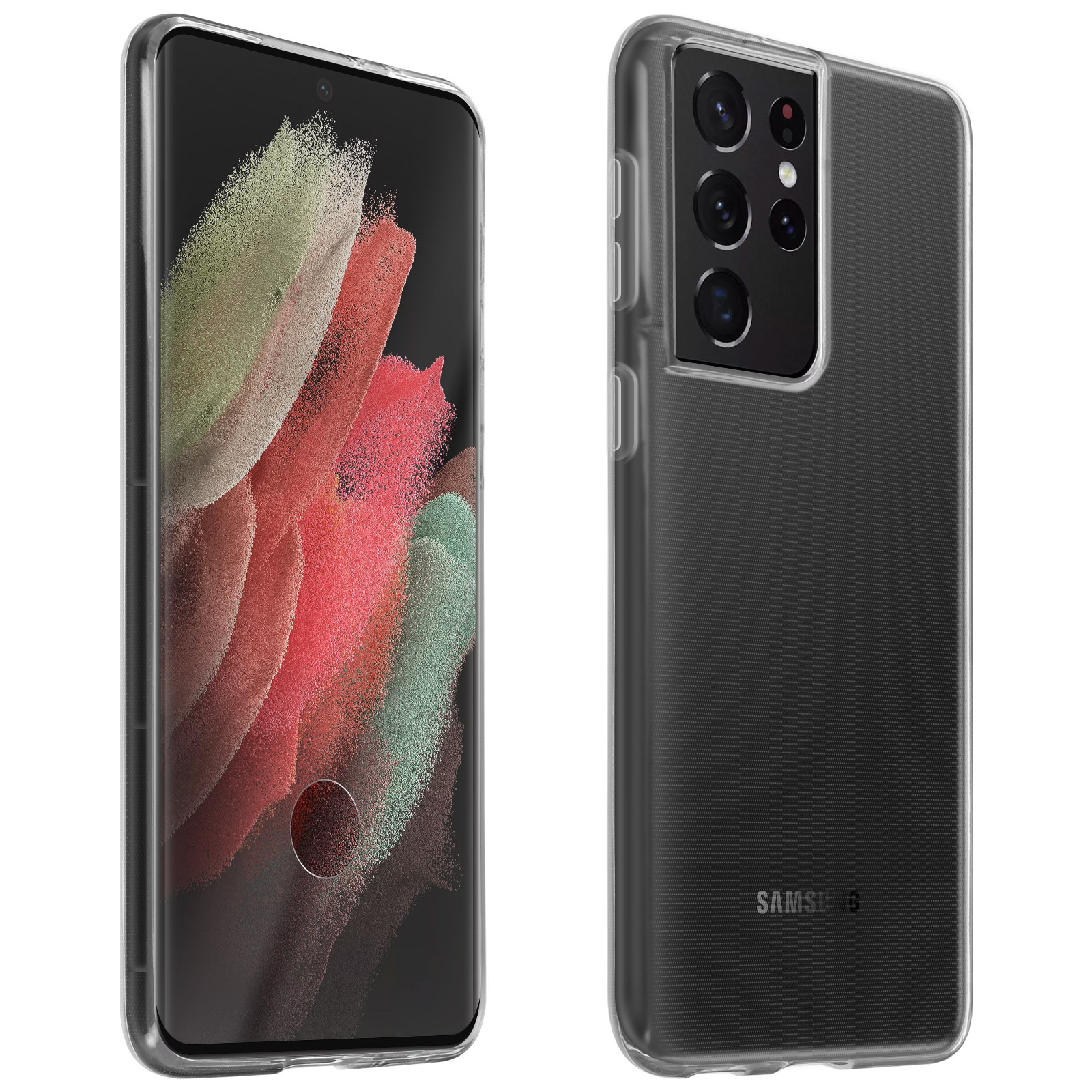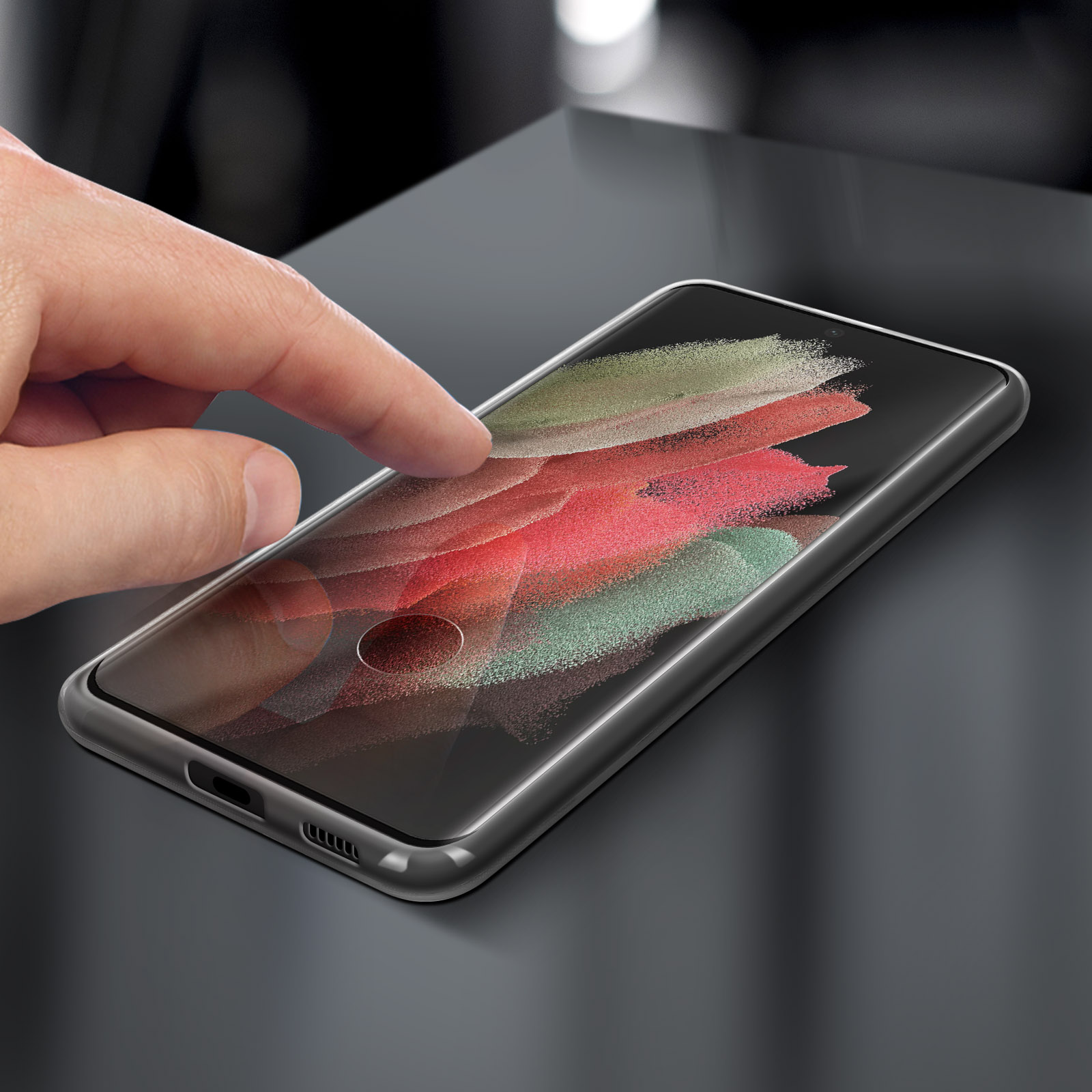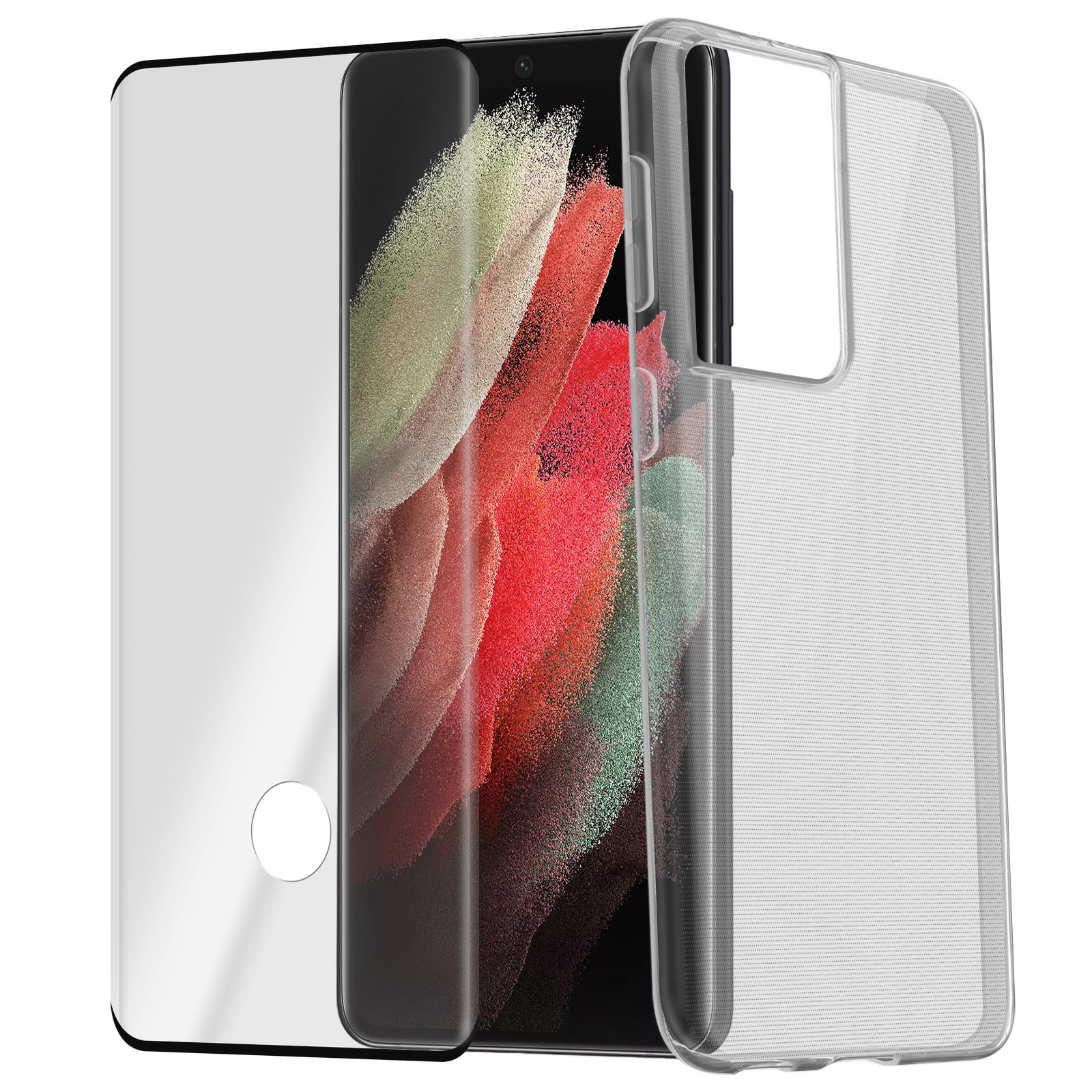 Pack protection Samsung Galaxy S21 Ultra. Coque transparente en silicone souple qui protège des chocs et rayures, tout en laissant le design du mobile visible. Film écran en verre trempé 9H ultra-résistant. Fonctionnalités accessibles.