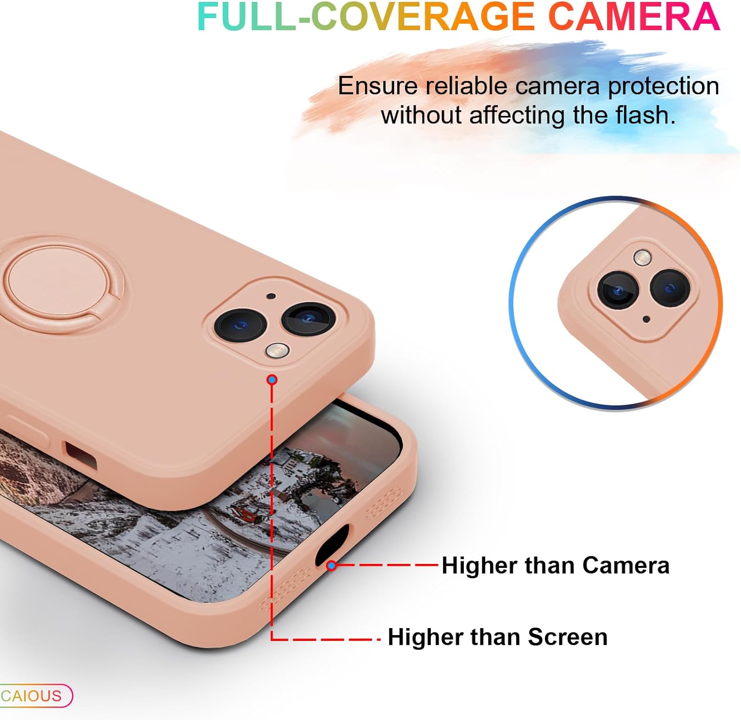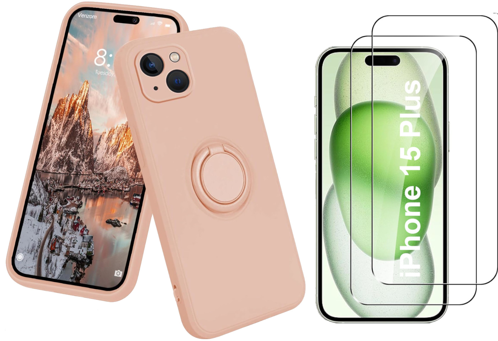 Coque Silicone Pour iPhone 15 Plus Couleur Rose Avec Anneau Support + 2 Verres Trempe Protection Ecran Li