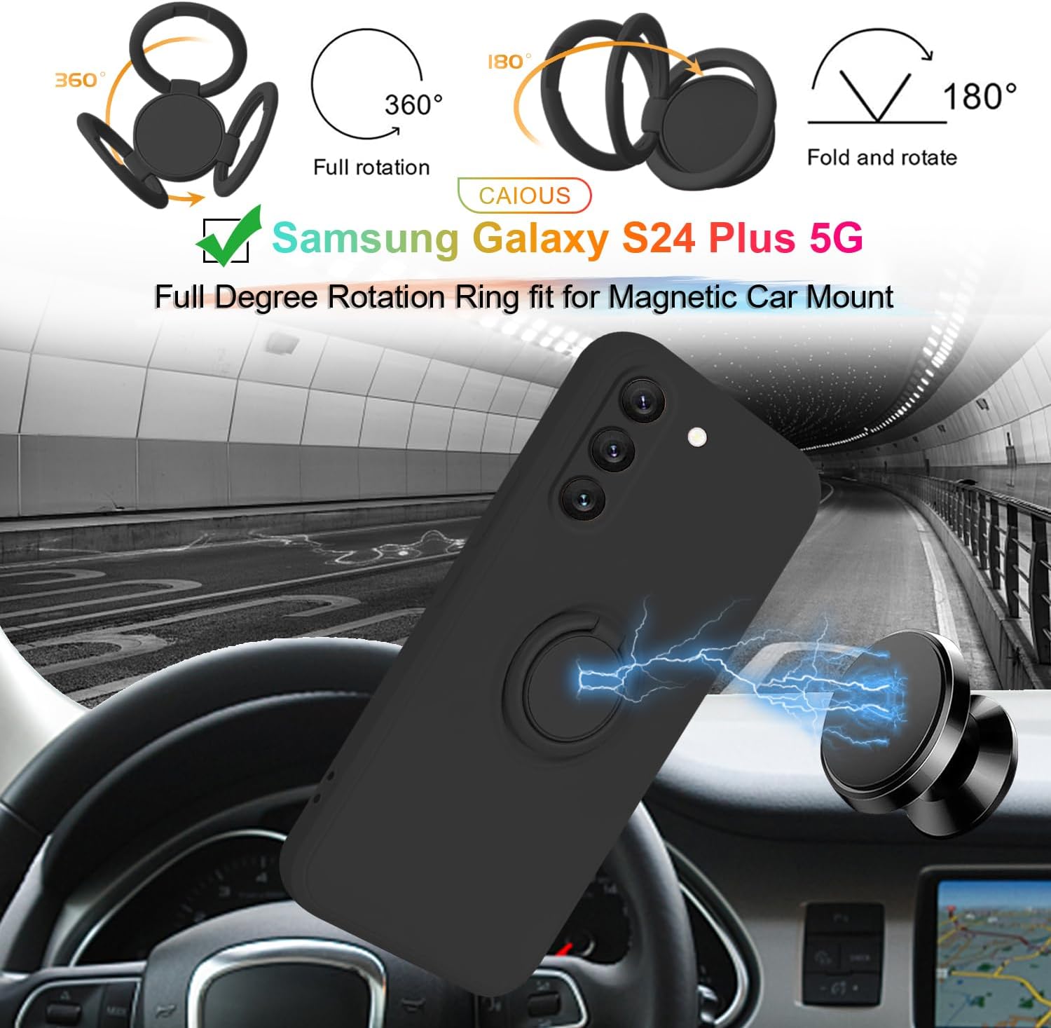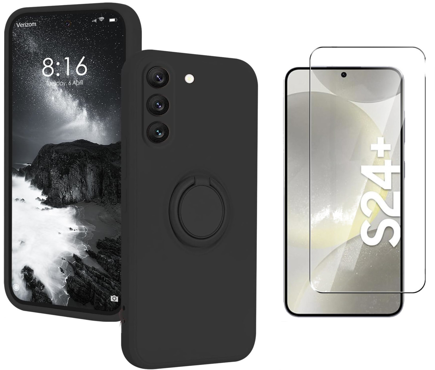 Compatible avec Samsung Galaxy S24 Plus (cran 6,7 pouces). Coque arriere en Silicone Rigide Avec Support Anneau Noir + Protection Ecran En Verre Trempe . Marque : Little Boutik\u00a9