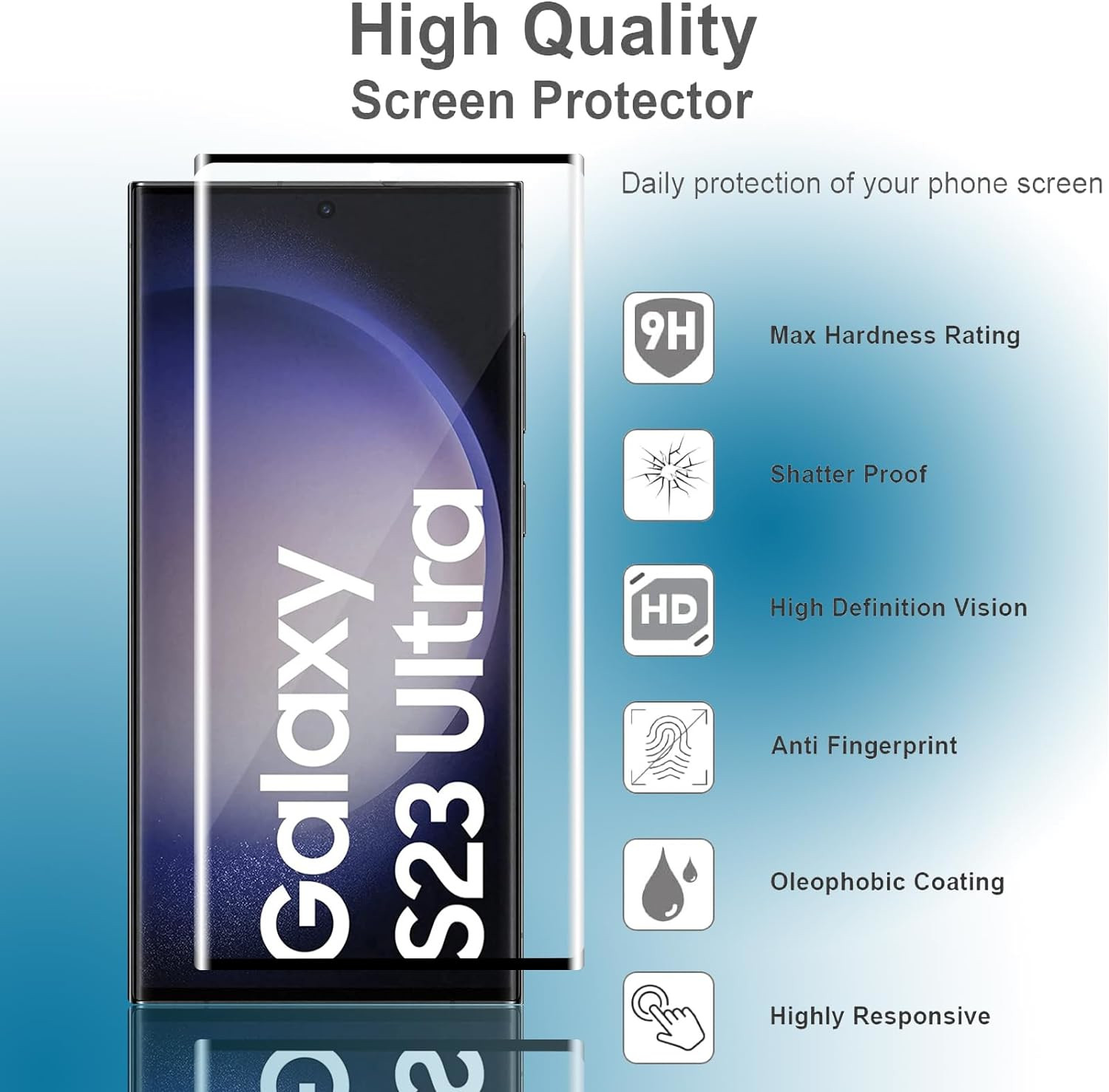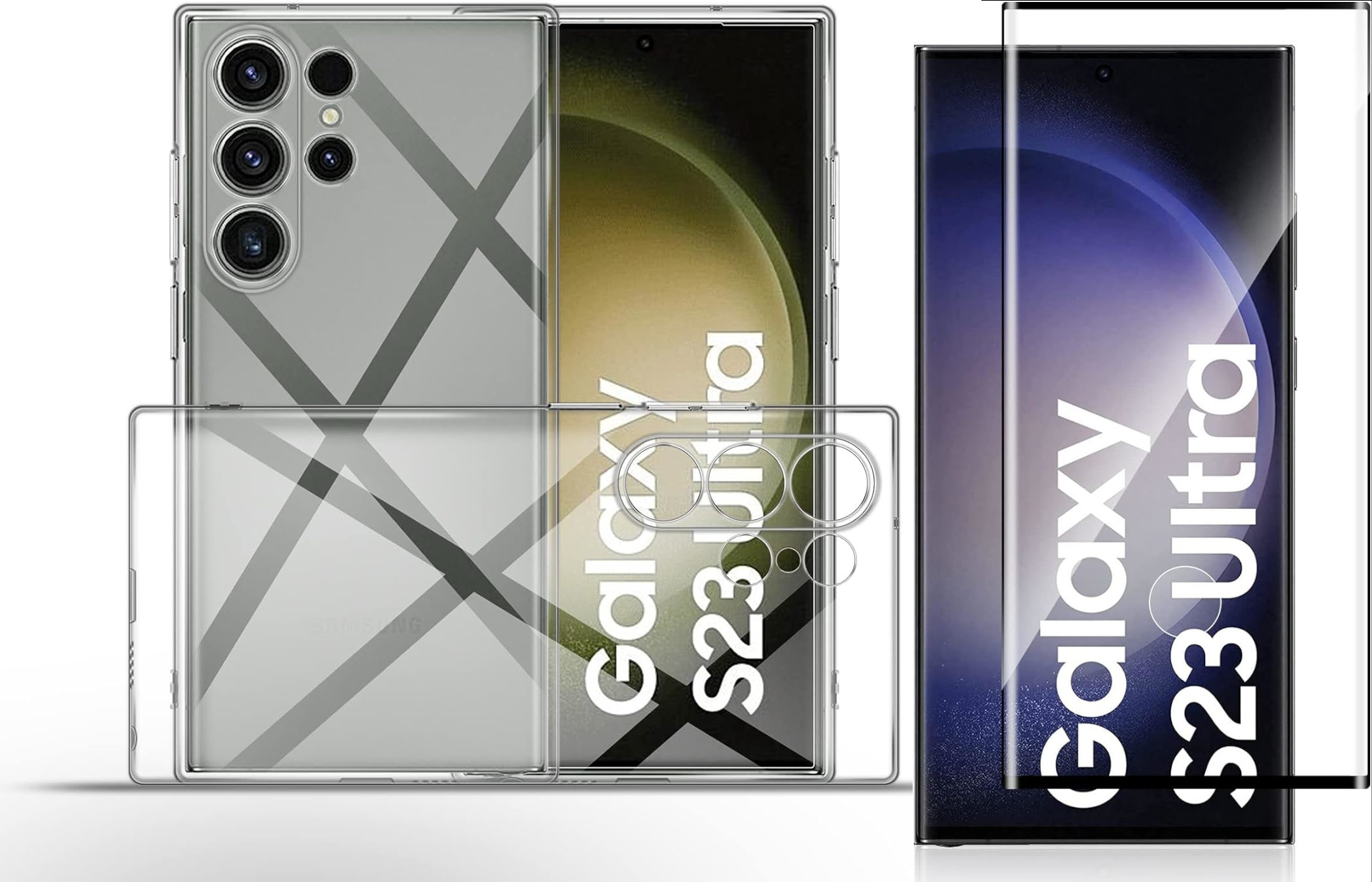 Compatible avec Samsung Galaxy S23 Ultra (écran 6,8 pouces). Pack de 1 Coque arrière en silicone souple Transparente + Verre Trempé avec Lingette nettoyante.
