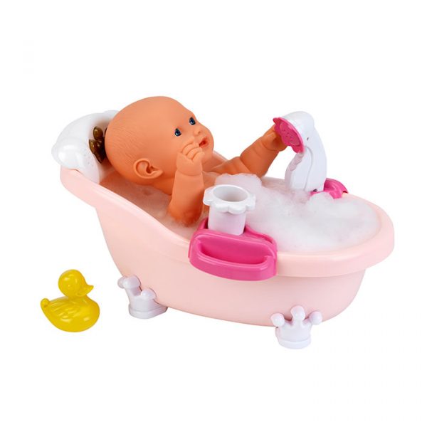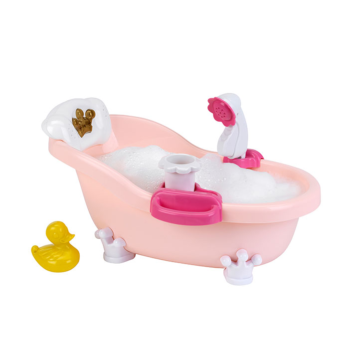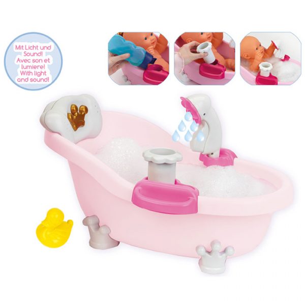 Cette ravissante baignoire offre un plaisir royal, dans le vrai sens du terme : lumière douce et sons mélodieux. Les enfants vont adorer y baigner leur poupée: en appuyant sur la petite couronne dorée, une musique harmonieuse se fait entendre, accompagnée d’une lumière à couleur changeante. C’est magique! Après avoir mis de l’eau et quelques gouttes de bain moussant dans la baignoire, il suffira d’appuyer sur la ravissante pompe en forme de fleurs et de laver et ensuite rincer la poupée au moyen de la douchette. Le succès est garanti pour les petits comme pour les grands! Baignoire pour poupées Baby Coralie Cette ravissante baignoire fera la joie des enfants: bain moussant et douchette sont faciles à actionner par un système de pompe des plus simples. En même temps se déclenchent les fonctions musicales et lumineuses qui font le côté unique de cette baignoire. Un joli petit canard accompagne le tout!